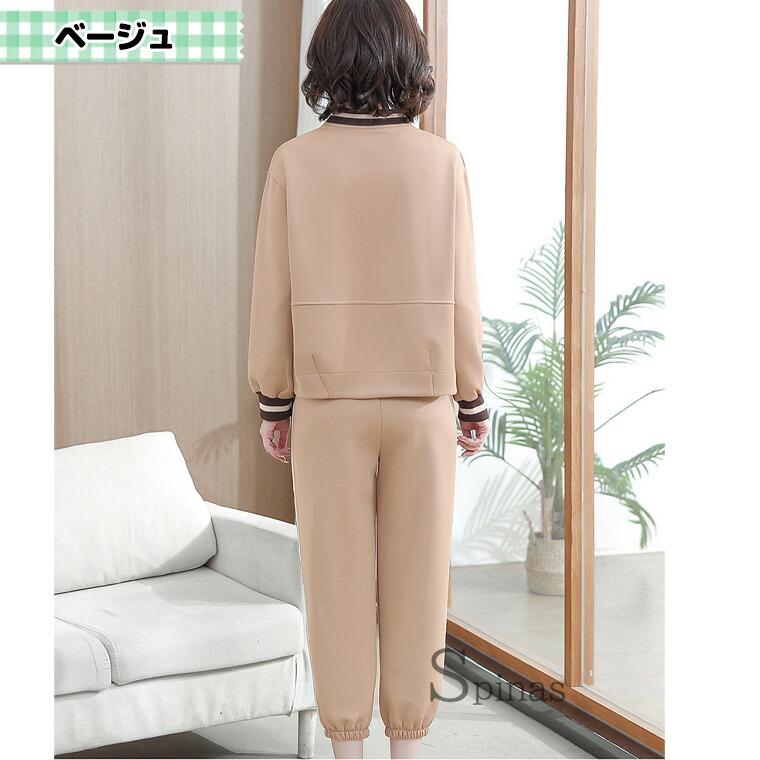 ノーカラーでお顔回りをすっきり見せ、動きやすいジャージ上下セット。