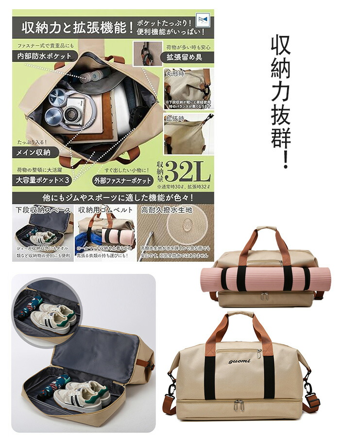 ◆大容量の2段収納スペース/このボストンバッグは、32リットルの大容量を誇り、特に便利なのが2段の収納スペースです。下段はシューズ収納用に設計されており、スポーツやジムでの着替えとは別にシューズを収納できるため、荷物が混ざる心配がありません。また、下段スペースはシューズ以外にもタオルや衣類などのアイテムを整理収納するのにも最適で、旅行バッグとしても非常に優れています。上段には25リットルのメイン収納があり、旅行や修学旅行などで必要な荷物をしっかり整理できます。特に1泊から2泊の旅行や出張には、十分な収納力を持ち、機内持ち込みも可能なサイズです。この多機能性は、日常の使用だけでなく、ゴルフ用バッグとしても、ゴルフウェアやアクセサリーを整理して持ち運べるため便利です。