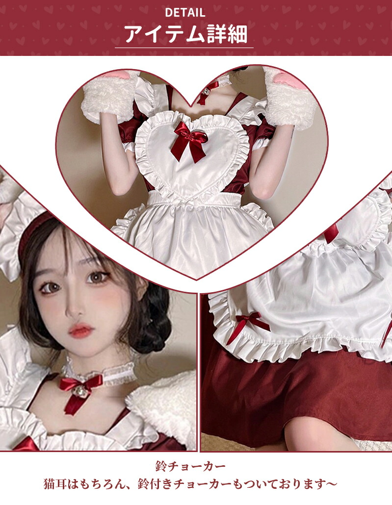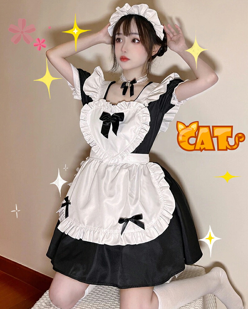 メイド服 コスプレ 猫 ネコ耳 かわいい フリル セクシー 赤 ブラック ゆめかわ 大人 レディース バレンタイン エプロン カチューシャ 半袖 スカート ワンピース 白 黒 ピンク 仮装 大 リボン
