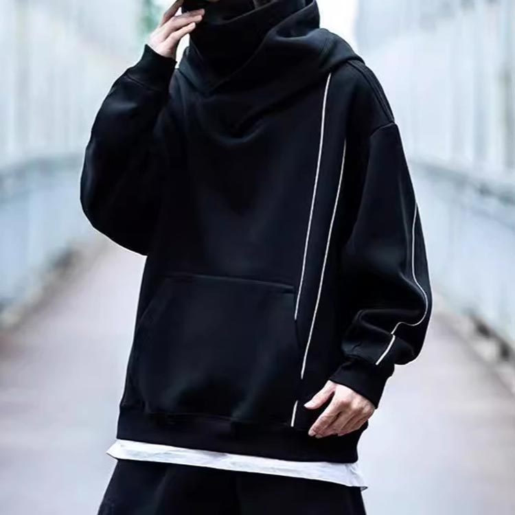 首元はハイネックトなって、袖口と裾はリブ仕様で、寒い日の保温に良く、男性の格好いいスタイリングを実現できるフード付きパーカーです。
