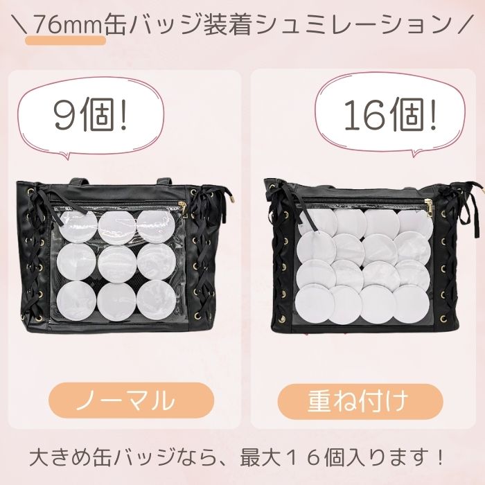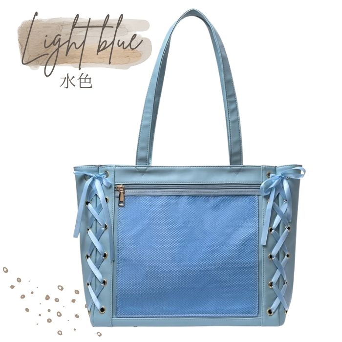 ☆ レースアップのデザインが可愛いトートタイプの痛バック です! 推し の写真、缶バッジ、ストラップ などを入れて自分の好みの痛バにアレンジしてください♪ ☆ 缶バッジ装飾用のメッシュシートも 付属します! ☆ 収納力抜群!A4のファイルも日用品もしっかり入るサイズ感がおすすめ♪ ☆ レザー調の素材を使っており、可愛さに上品さをプラス◎ 6色展開ですのでお好きなカラーをお選びください!