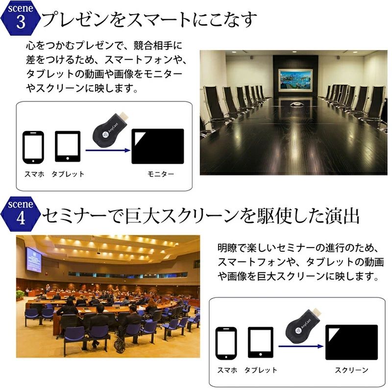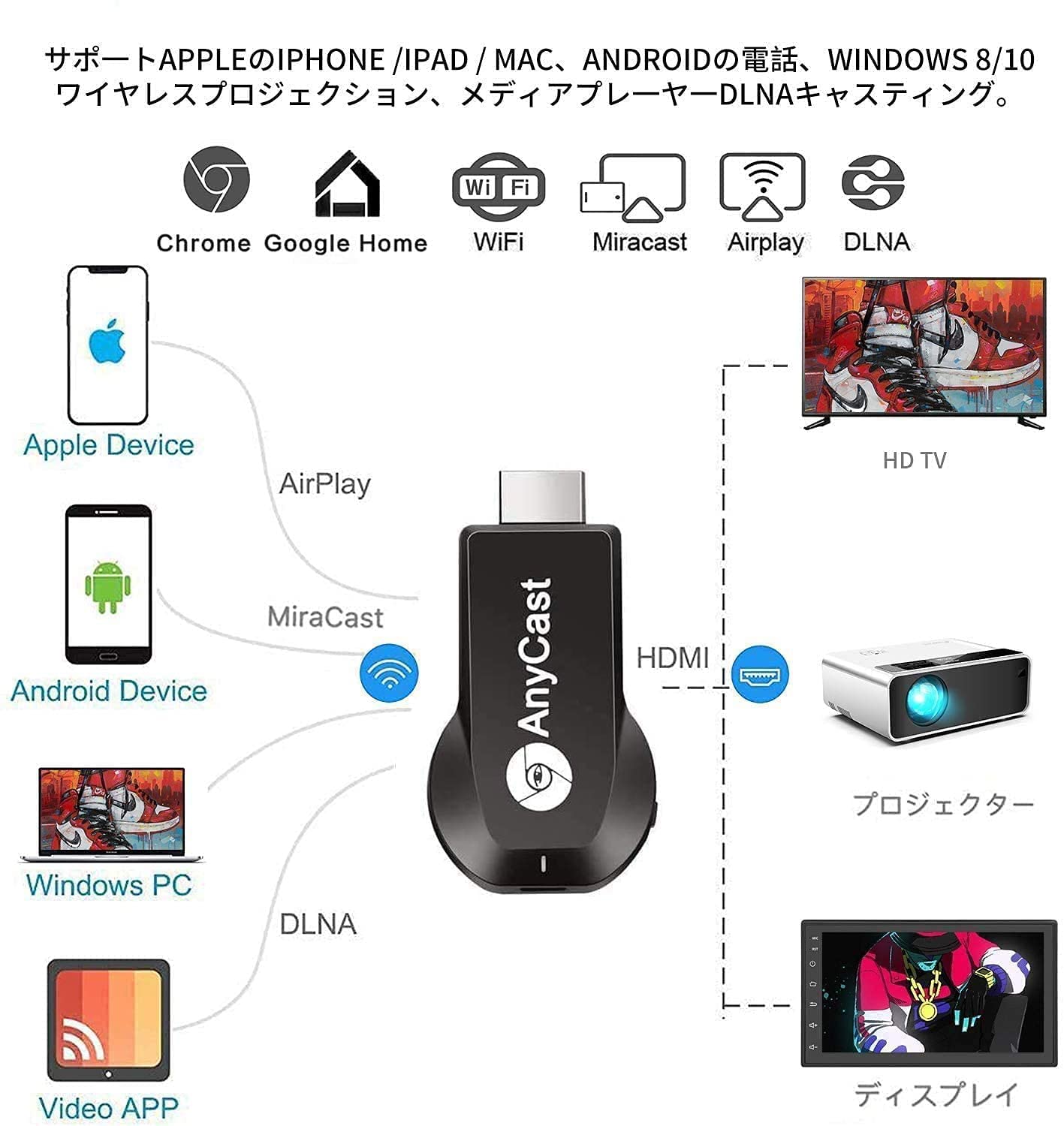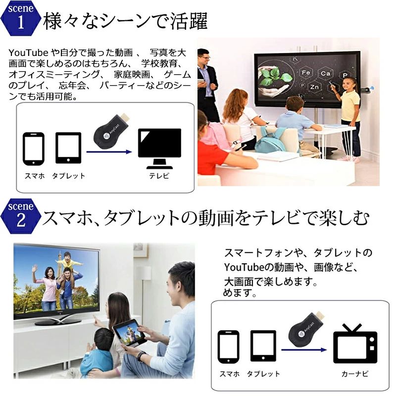 適用機種 :Miracast/Airplay/DLNA をサポートします。Android 4.4 および iOS 9.0、MacOS 10、Windows 8.1 と互換性があります (Miracast が有効になっている必要があります。最初に確認してください)。ほとんどのビデオ Web サイト (アプリまたはオンライン) をサポート - YouTube、Facebook、Twitter。Netflix/ iTunes/ Amazon Video/ HBO go/ Hulu Plus/ Honda Motor/ ESPN/Google Pixel などの著作権が必要なアプリには対応していません。友人の集まりや家族の再会の間、会議、自宅、教室の大画面でプレゼンテーションやファイルを共有できます。