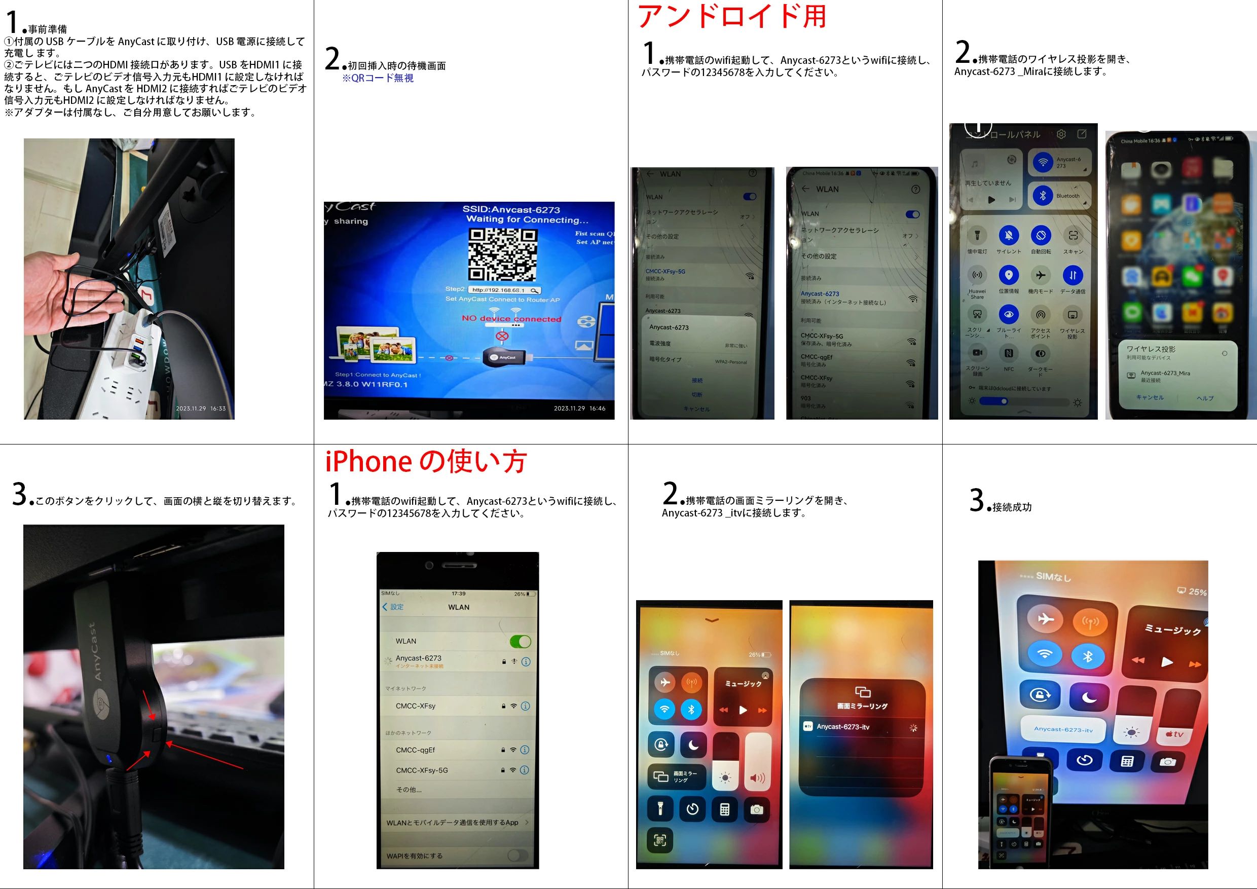 3、AnyCast をテレビなどの HDMI 端子に差込ます。画面には SSID とパスワ ードが出ます。それからアンドロイド携帯のWiFi を開いて SSID のWiFiを見 つけ、パスワードを入力して接続できます(パスワード:12345678)。