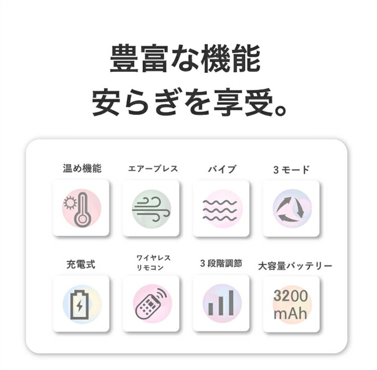 3つの機能はそれぞれ3段階の調節が可能です。人の手のような感覚を体感できるエアープレス機能、じんわりと深部まで温める温め機能、着用部を程よく刺激するバイブレーション機能、それぞれを使い分けて日々頑張る足をリフレッシュさせましょう。