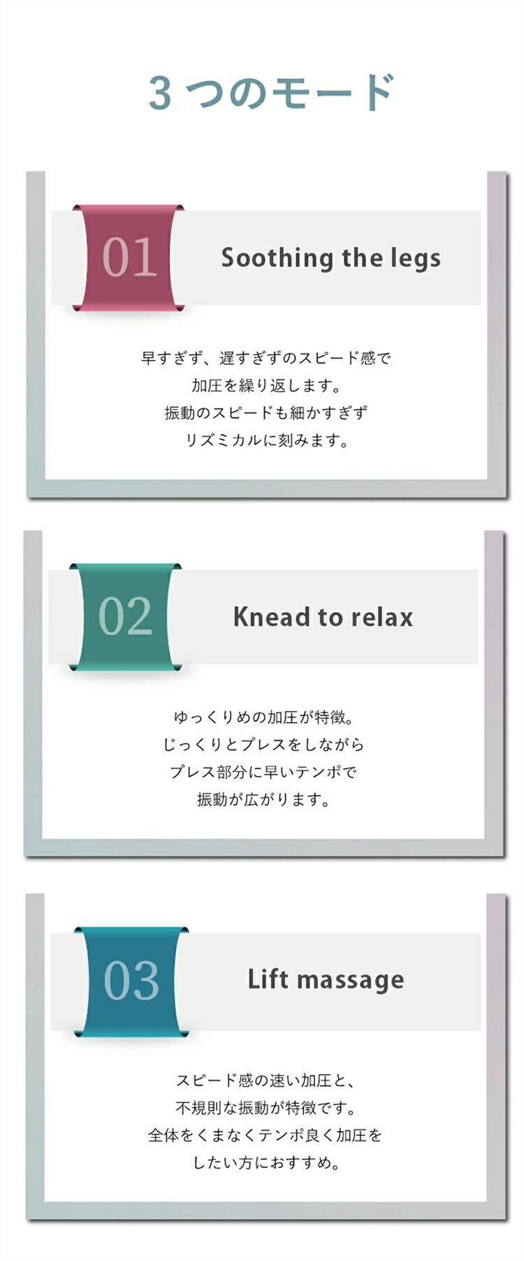 エアープレス、温め、バイブレーションの3つの機能と、それぞれを組み合わせた3つのコースモードでふくらはぎを中心としたレッグケアを体験いただけます。