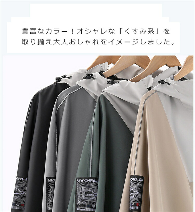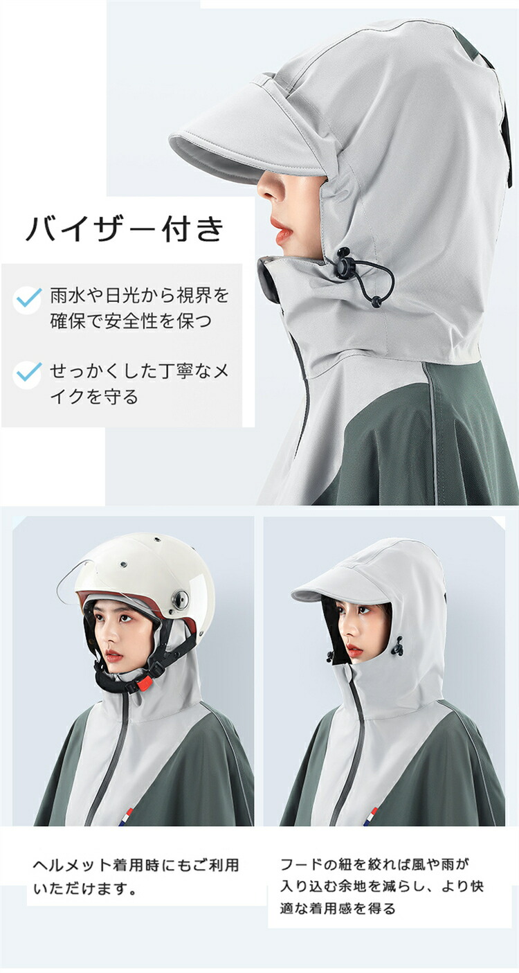 ・フード付き&顔が濡れにくいハイネック仕様なので、前から雨が強く吹き付ける日もしっかりとガード!