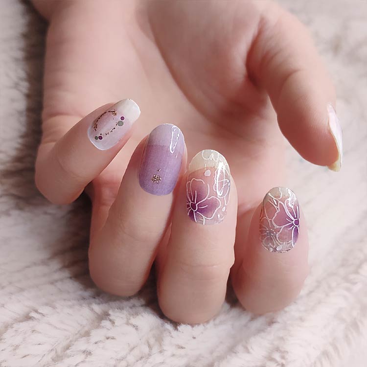 20シート入り(240枚セット)【ご使用前に】●爪に油分や水分、汚れが付着しているとシールが剥がれやすくなりますので、爪の表面をキレイに拭き取ってください。●甘皮を処理し、付属のファイルなどで爪の形や表面を整えるとよりキレイに仕上がります。●シートからネイルシールを剥がす際にはシートの外側部分を持って剥がしてください。(1)製品を爪に合わせ、爪よりも少し小さめのネイルシールをお選びください。(2)キューティクルラインと1mmほどの余裕があるところにネイルシールを貼ってください。(3)ネイルシールを貼って余りのシールは爪の形に合わせて折ってください。ファイルを利用して、爪の下の方向に向けて余りのネイルシールを削ってください。(4)お好みの硬化方法を選んでください。・寝る前に貼り硬化する場合・自然光で硬化する場合:約2時間(自然光が多い室内と室外にて)・UV&LEDライトで硬化する場合:約30秒【剥がし方】●ウッドスティックでキューティクルラインからゆっくり押出しながら剥がしてください。