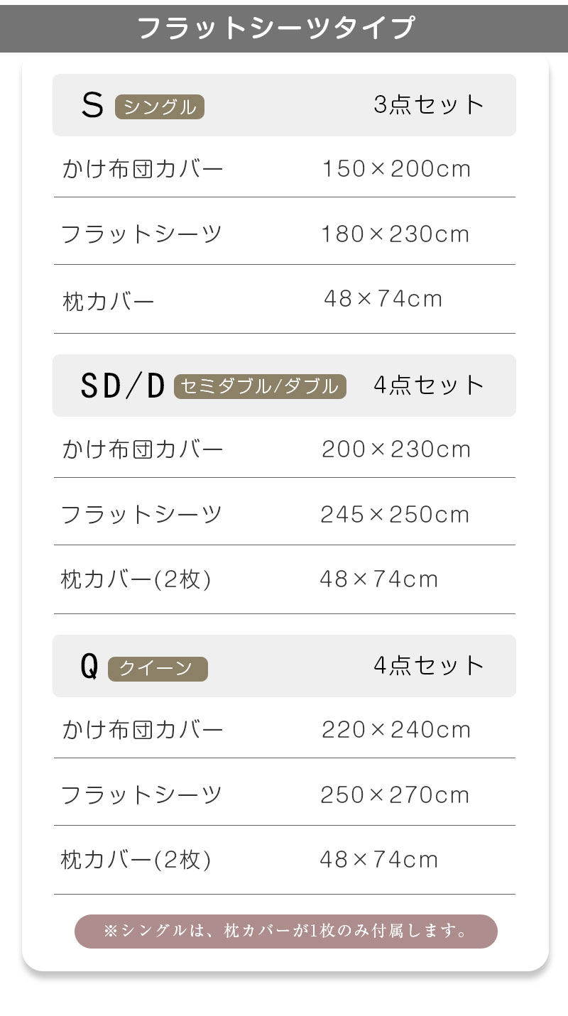 ※シングルは、枕カバーが1枚のみ付属します。
