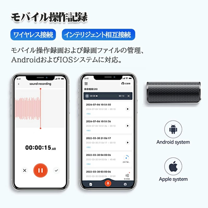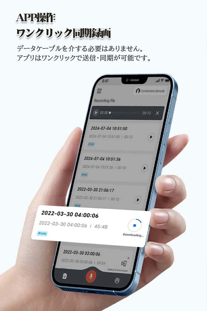 Bluetooth 5.0技術を用いてスマートフォンと簡単に接続できます。10メートル以内、アプリを使用すれば「録音+文字起こし」を同時に行い、本体では近くでの即時録音が可能です。これにより、設定や操作をするためにレコーダーに直接触れる必要がなく、手軽に録音を開始したり停止したりできる柔軟性を提供します。
