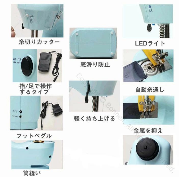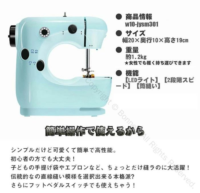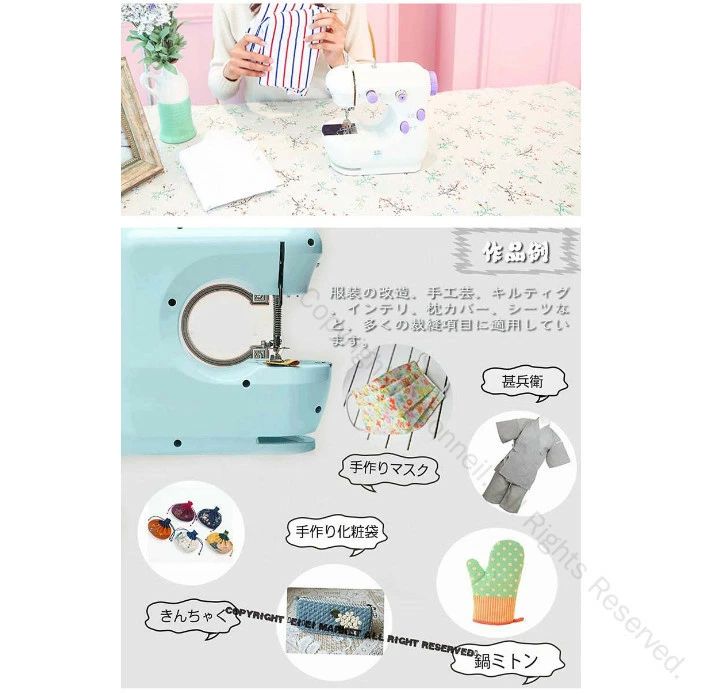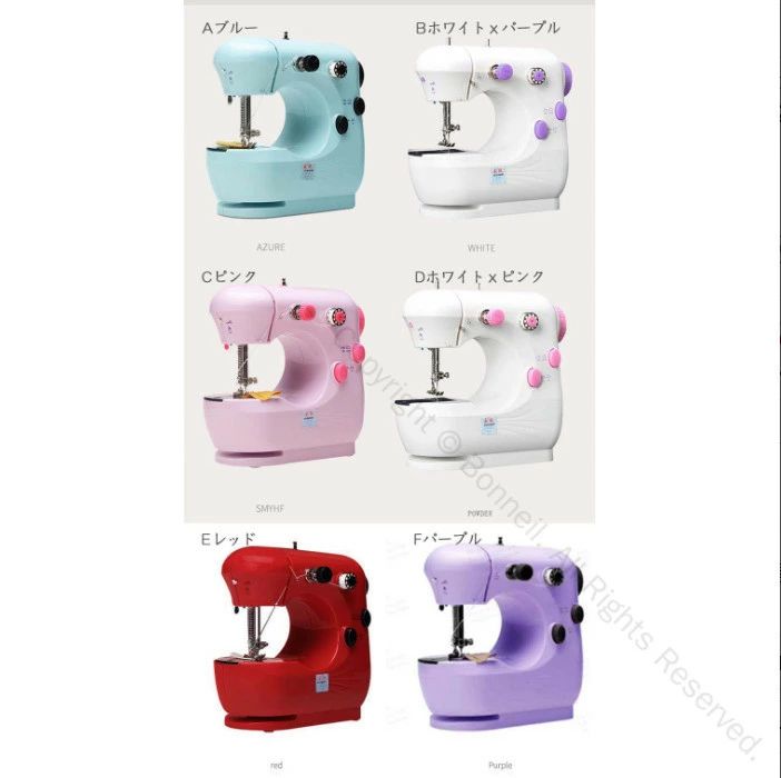 【カラー】 Aブルー Bホワイトxパープル CピンクDホワイトxピンク Eレッド Fパープル【素材】 ■ABS樹脂「耐用性」【パワー】 ■6W/省エネ【サイズ】 サイズ:20×19×20cmサイズに不安の方はお問い合わせの上、ご注文ください。【重量】 ■1.2kg【セット内容】 =電動ミシン*1フットぺダル*1PSE認証アダプタ*1白系/黒系ボビン「各*1」空のボビン*2系通し*1予備ミシン針*1日本語の取扱説明書*1【特徴】 1.●{コンパクト手軽デザイン}ミシンが苦手という方にも扱いやすいシンプルデザインだけでなく、穏やかあるコンパクトの 設計で、簡単操作で使えるから、サイズはただ20*19*10CMと重さ1.2kgし、使いたいときにサッと取り出せて使用後はすぐに収納可能。 お部屋を彩る、この艶やかであるカラーのミシンが買えるのは当店だけ!2.●{2020機能対応に進化!}機能性が優れるそしてリニューアルでさらに使いやすい!突然のエラーは最小限に抑えることが出来る、 初心者の方でも安心してご使用していただけます。伝統的なミシンと違う、改良した後作動音がもっと小さくて、安定的に操作が可能です。 このミシンはママや主婦など初心者てにちょうどいい、迷うことなく気軽にお使い頂ける一台です!3.●{スピード調整可能}2段階速度調整が付いているので、ゆっくりやはやいが欲しいというご要望にお対応えしました、 さらに袖縫いや筒縫いに縫製がもっと合わせることができます。{アームスリット}アームスリットがあるので、筒状の物を縫うことができる。 アームスリットに布地を入れて使用すると袖や裾等、筒状の物が縫いやすくなります。4.●{LEDラント付き}見づらい手元を明るく照らします。針元にLEDライトが付いて 、針元を明るく照らします。 縫っている最中、針元が見やすいし、ライトはソフトで眩しくないので、屋内で作業に適用します。5.●{幅広く使える}お客様の異なるDIY裁縫需要を満たすこと、自宅で簡単に裁縫を楽しめます。やワンピース縫い、 子供の幼稚園入園からの手作り宿題など便利な存在です。服装の改造、手工芸、キルティグ、インテリ、枕カバー、シーツなど、 多くの裁縫項目に適用しています。直線縫うだけですが、マスクや小物などが簡単な手作り適します。【注意事項】 【納期について】▲ご入金確認後、3-5営業日発送予定。(キャンセル・ご変更等のご連絡は、入金後の2日以内にお願い致します。)▲注文個数によりお届け日が変わることがあります。至急の場合、予め使用希望日をご連絡ください。▲天候や交通事情等の都合により配送期間は前後いたします。予めご承知下さいませ。【について】▲数の更新は随時行っておりますが、お買い上げいただいた商品が、品切れになってしまうこともございます。その場合、お客様には必ず連絡をいたしますが、万が一入荷予定がない場合は、キャンセルさせていただく場合もございますことをあらかじめご了承ください。▲サイズは素人採寸のため、2-5cm前後の誤差が生じる場合がございます。予めご了承下さいませ。【梱包について】▲現在、弊ショップの包装につきましては、簡易包装にて郵送しておりますので、プレゼント用のラッピング包装、熨斗の添付はできません。ご了承の上で、お買い上げください。▲複数ご注文いただいた場合の同梱配送は可能です。【返品・交換について】▲返品・交換の場合、未使用の商品のみ到着日から7日以内にご連絡頂ければ、対応させて頂きます。万が一お届け商品がご注文内容と異なったり、欠陥、汚損があった場合、交換、もしくは返金させて頂きます。【その他】▲モニターの発色の具合によって実物とと色が異なる場合がございます。実物に近いカラーはカラーバリエーションをご参考ください。▲洗濯の際は色落ちの可能性がありますので単品手洗いでお願いいたします。▲商品到着時に箱が破損、商品破損、また梱包に異常があった場合は、発送中の破損事故となりますので、受け取り拒否でお願い致します!※折り畳んでの包装の都合上、使い初めの際にシワが見られる場合がありますが、使用するにつれて目立たなくなりますので、不良品対象外となります。予めご了承ください。▲商品発送後の住所変更、サイズとカラーの変更、キャンセルはお受けできません。▲初期不良品以外の返品、返金はお受けできませんので、予めご了承ください。▲イメージ違い、サイズ及びカラーの買い間違えなどによる返品、返金、交換はお受けできません。予めご了承ください。▲万一汚れや破損などの不良品が届いた場合、必ず到着日を含め3日以内にご連絡をください。▲輸入品のため、メーカーや仕入先の保管方法の違いや、長距離輸送や航空輸送により、多少細かなキズや汚れ等が見られる場合がございます。▲ご存知の通り海外の工場での縫製は日本の工場と比べますと、細かい点で雑に見えるものがございます。不良品ではありません。