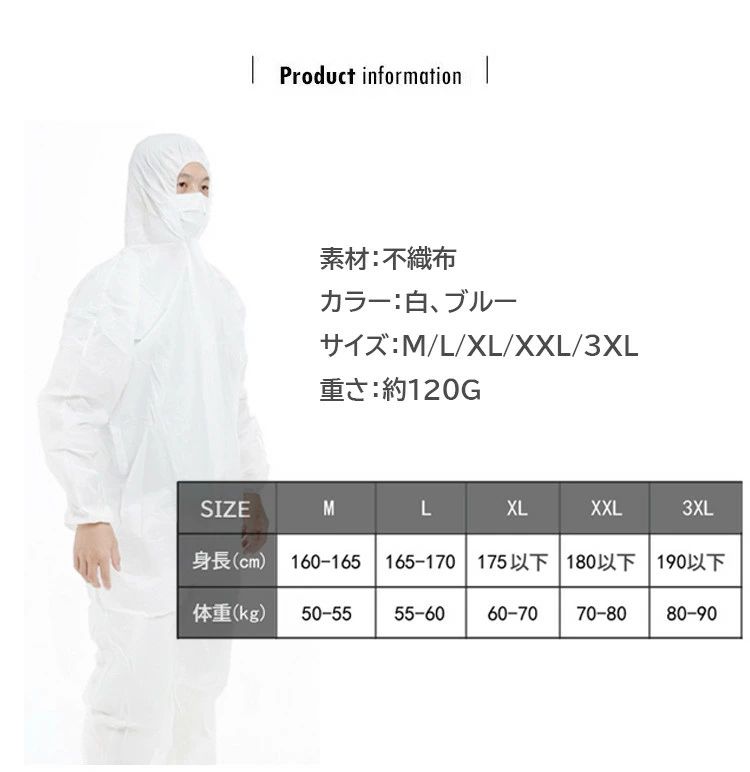 10枚入り 防護服 保護服 使い捨て メンズファッション 人気 M L XL XXL 3XL 白(PP-通常防塵):3630円税込 ブルー(PP-通常防塵):3630円税込 白(SMS-厚め防水):7150円税込 ブルー(SMS-厚め防水):7150円税込