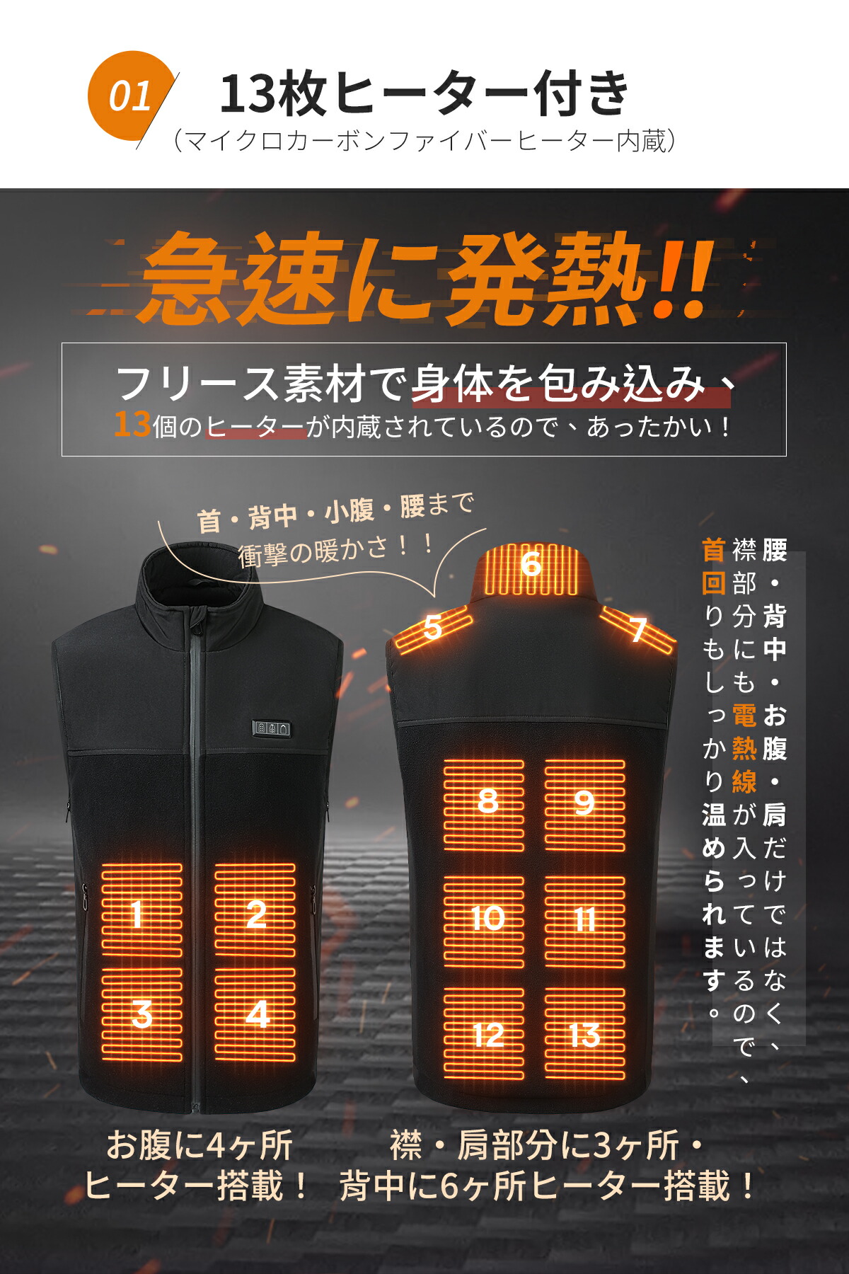 商品カテゴリ:防寒の最強対策!電熱ベスト 発熱ベスト フリース素材 フリースベスト フリース ベスト インナー 加熱ベスト 電気ベスト 電熱ウェア ヒーターベスト バッテリー付き 電熱ベスト 温熱ベスト ベストレディース メンズ 前開き 防寒グッズ USB給電式 サイズ調節 サイドファスナー 大きいサイズ バッテリー付 加熱パネル 2023 発熱 防寒 柔らかい キャンプ アウトドア 登山 釣り ジャケット電熱ベスト 発熱ベスト電熱ベスト おしゃれ 日本製 繊維ヒーター 13枚パネルヒーター PSE認証取得 快速加熱 即暖 軽量素材 水洗可能 3段階調温 遠赤外線 防寒保温 大きめ 極大BIG S-9XL 特大 電熱ジャケット 大きいサイズのベスト S M L LL 2XL 3XL 4XL 5XL 6XL 7XL 8XL 9XL バイク ゴルフ 作業服 屋外作業 通勤通学 高齢者 屋外 男女兼用 送料無料 誕生日プレゼント クリスマス プレゼント ギフト 父の日 母の日 敬老の日 新生活 フルセット ヒートベスト ヒーター 襟付き 電気 レディース コンセントレス USBヒーターベスト 洗える 中綿ベスト