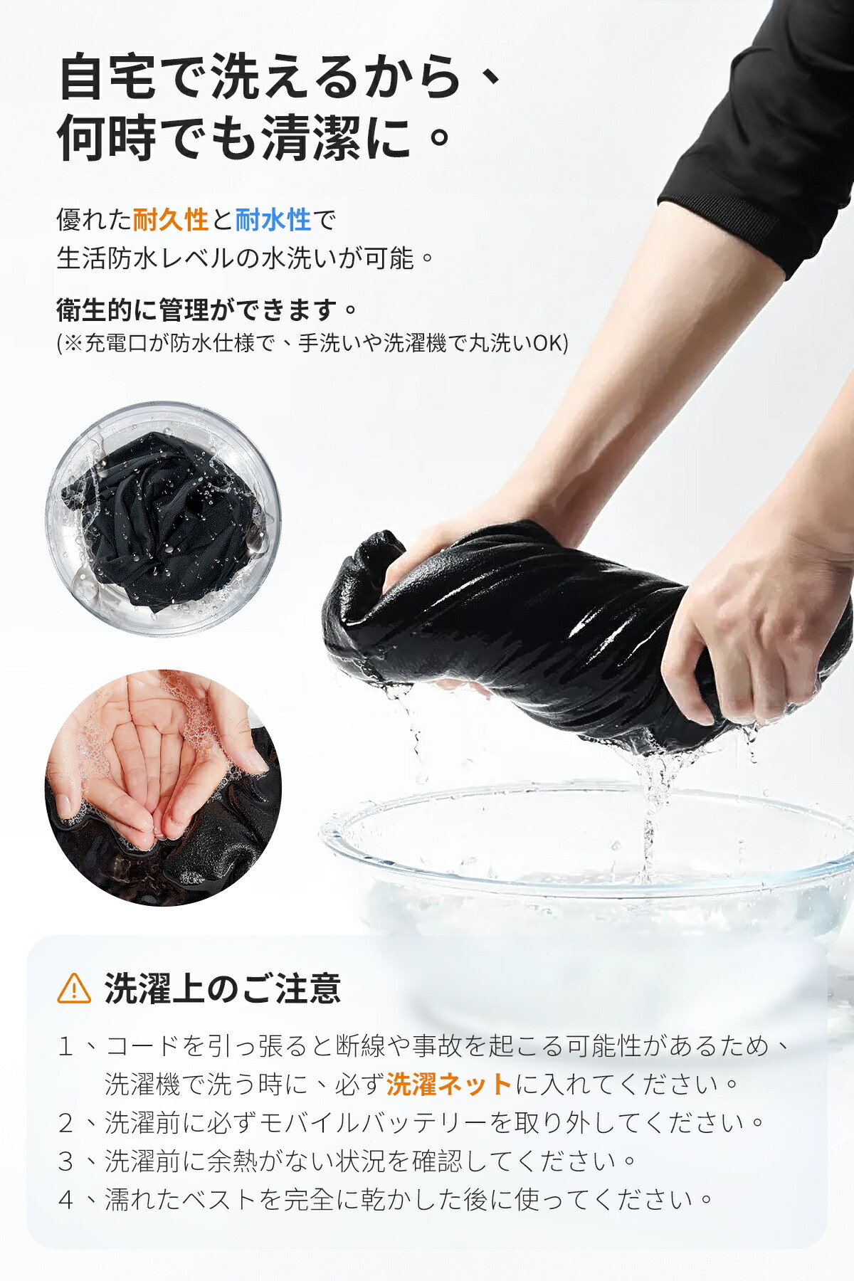 3段階温度調節、30分タイマー機能付き。汚れが気になれば、ベスト本体は水洗い可能で、衛生的に管理ができます。