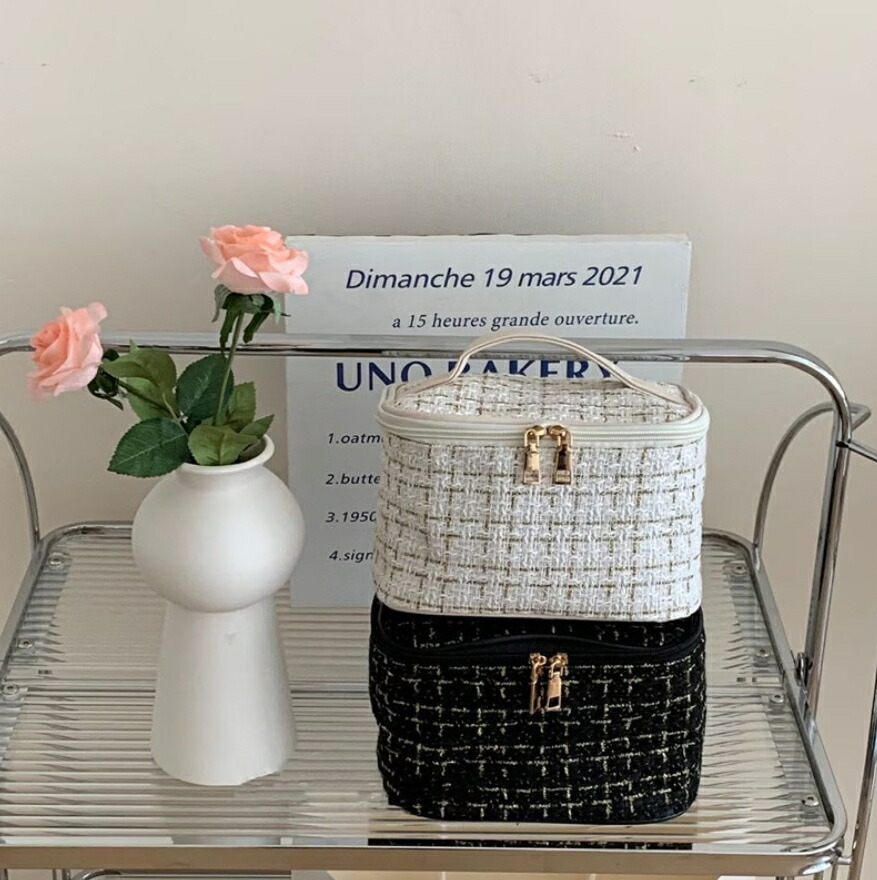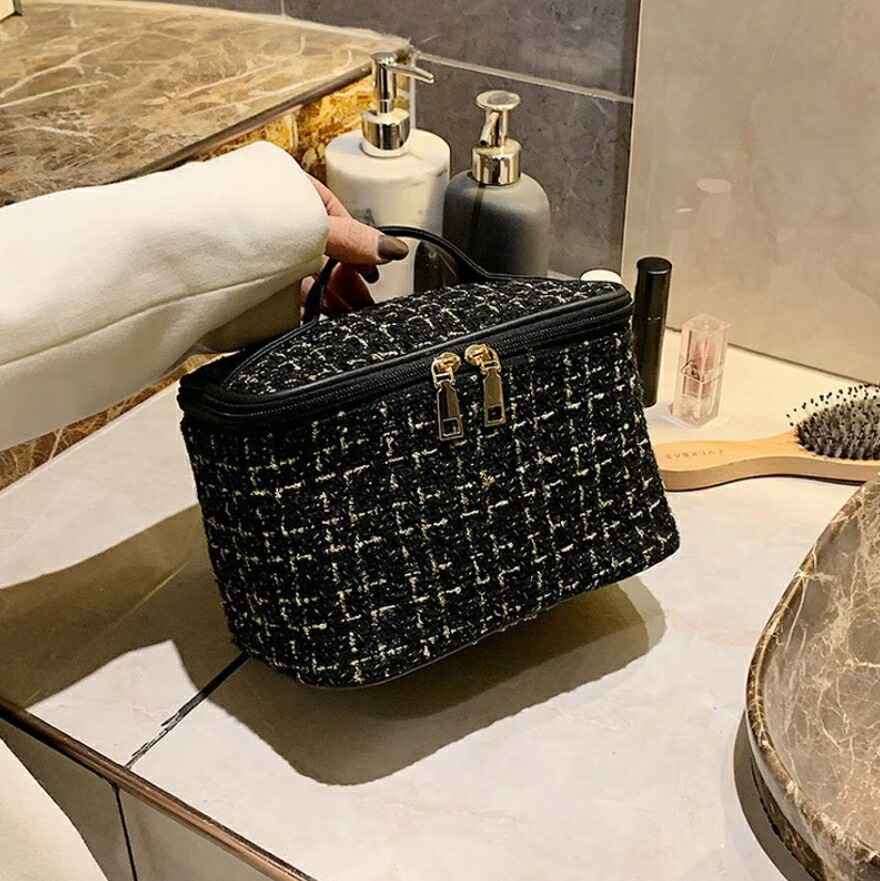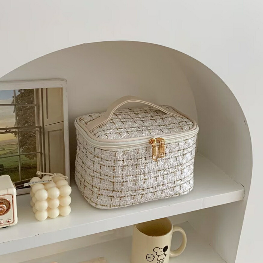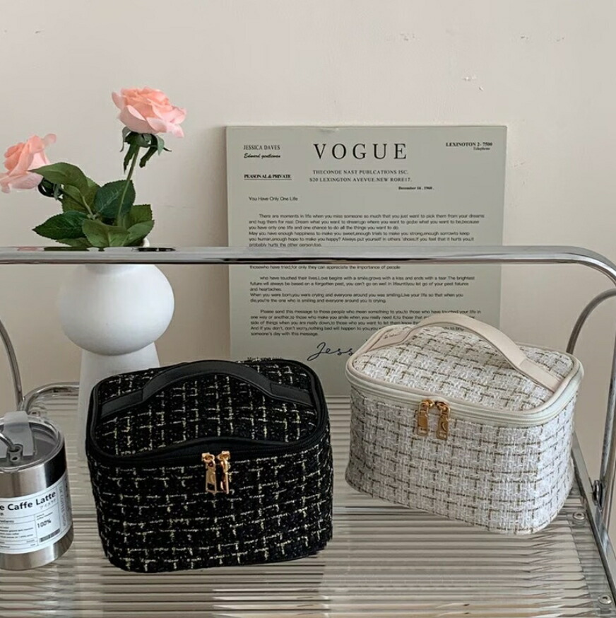 たっぷりとコスメが収納できるツイードのバニティポーチです