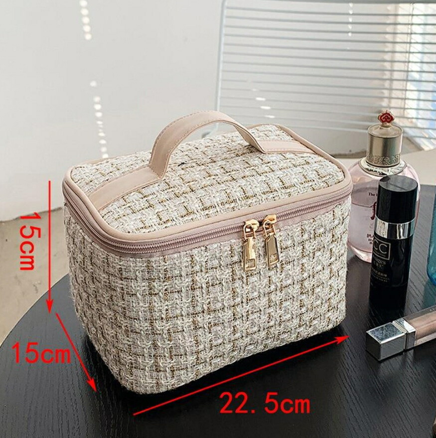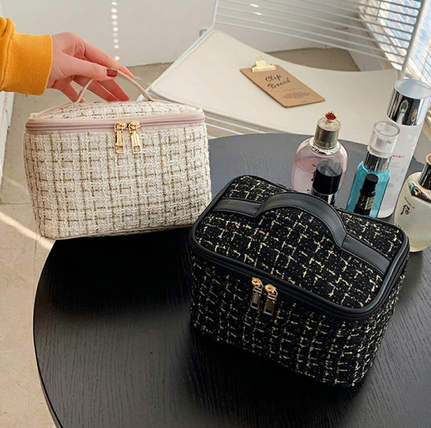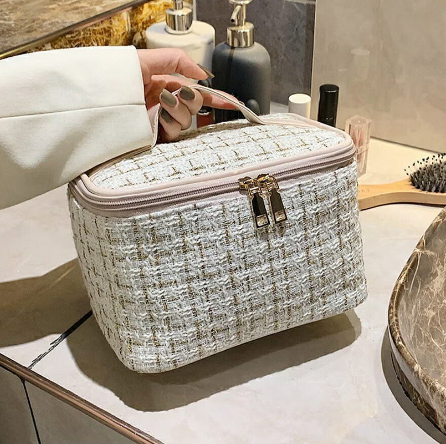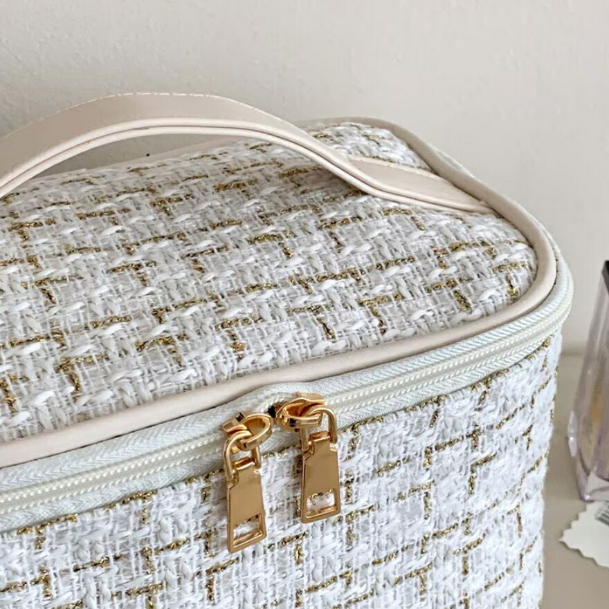 たっぷりとコスメが収納できるツイードのバニティポーチです