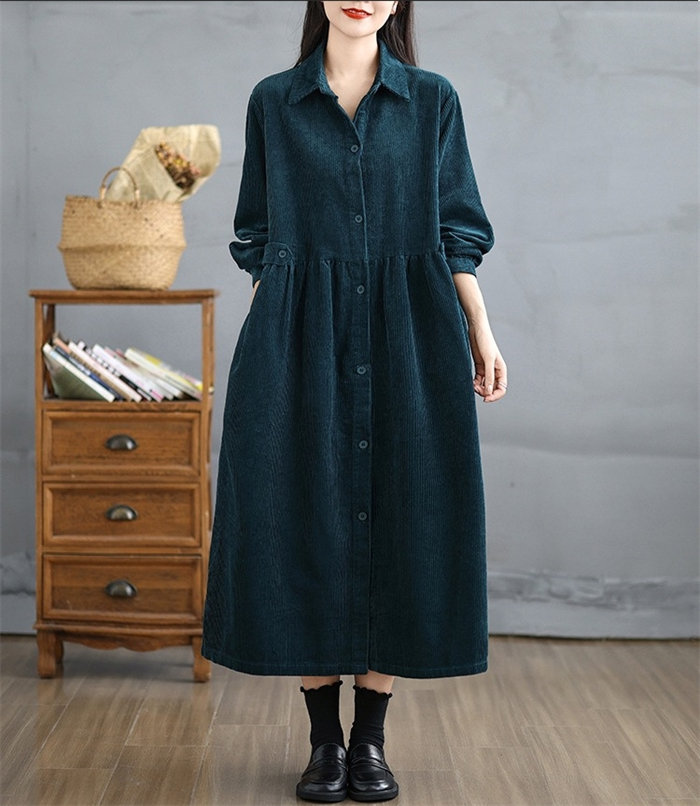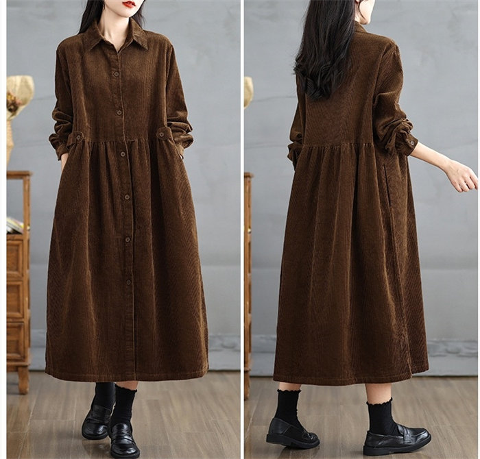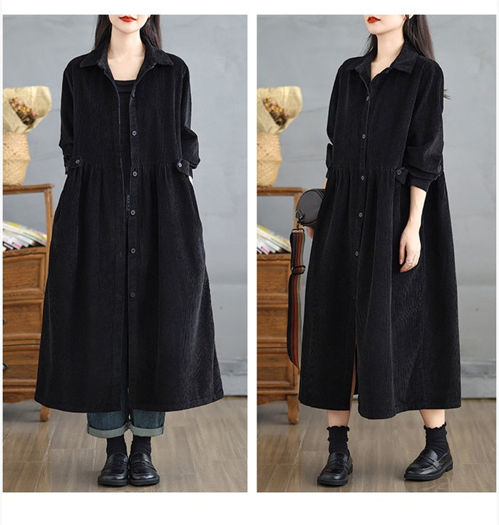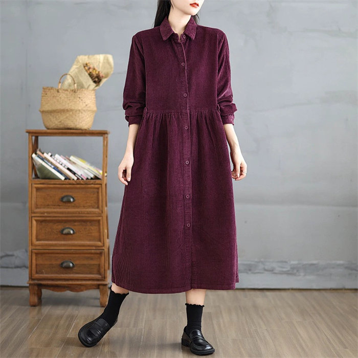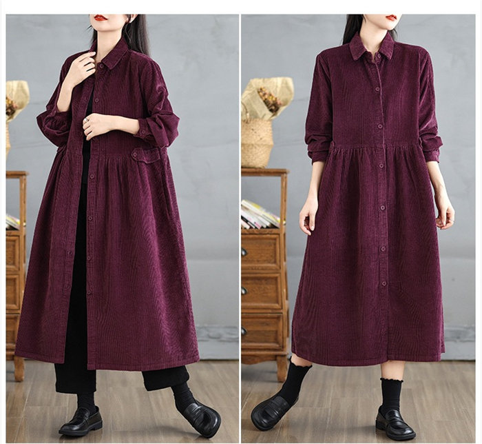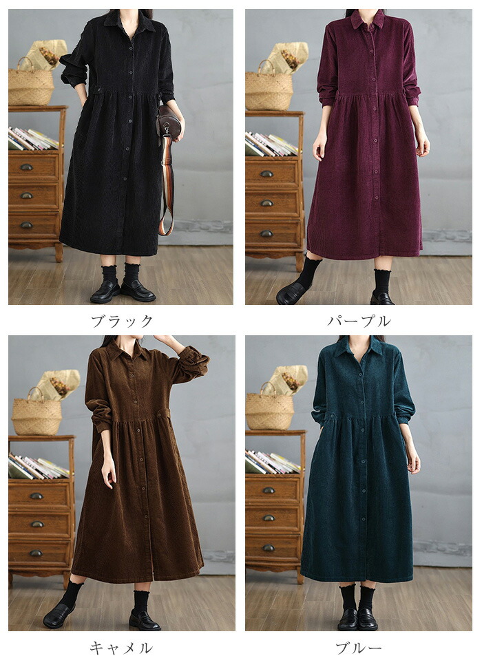 ロングワンピース コーデュロイ シャツ レディースファッション 続々登場 ブラック パープル キャメル ブルー M L XL 2XL