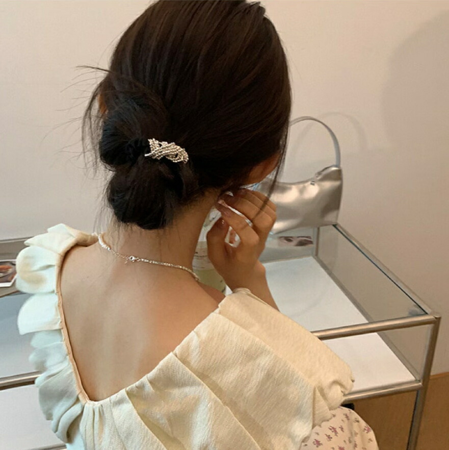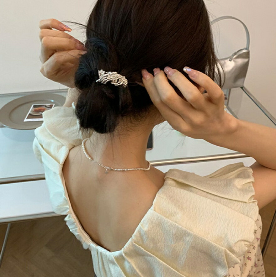 光を受けて煌めくビーズが、華やかなうしろ姿を演出するシュシュ。