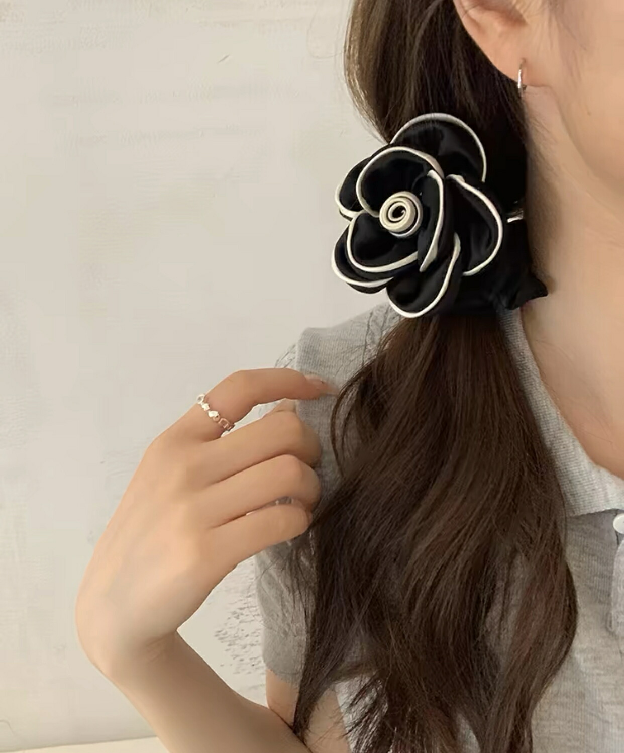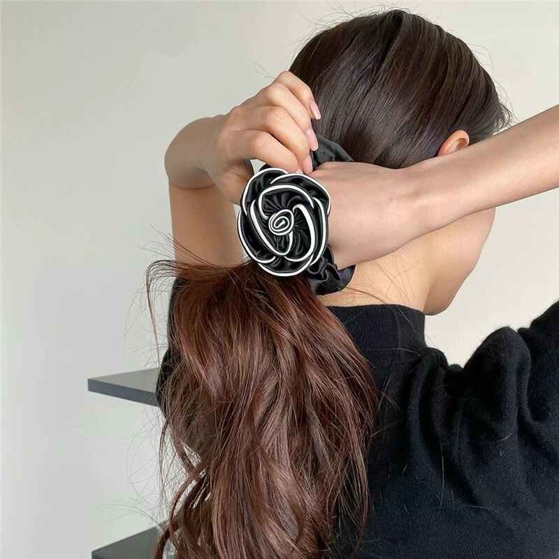 フラワーシュシュ カメリア サテンシュシュ ヘアゴム バイカラー ブラック ホワイト 大人可愛い おしゃれ 上品 レディースヘアアクセサリー