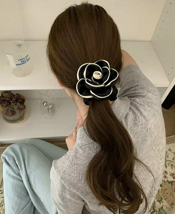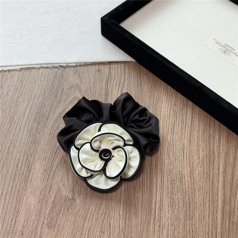 フラワーシュシュ カメリア サテンシュシュ ヘアゴム バイカラー ブラック ホワイト おしゃれ 上品 レディースヘアアクセサリー 大人可愛い