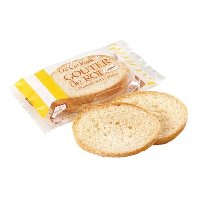 バターを極限まで減らして軽さを徹底的に追求し、1枚約22kcalで仕上げたヘルシーラスク オイルカットラスク「グーテ・デ・ロワ レジェ。「レジェ」とはフランス語で“軽い”を意味します。従来の「グーテ・デ・ロワ」と比べ、バターの使用を約98%減らし、脂質を約95%カットしたことで1枚あたり約22kcalに仕上げたヘルシーなオイルカットラスクです。小麦本来の香ばしさとお砂糖の優しい甘みが引き立ち、素朴ながらも奥深い味わいになっております。