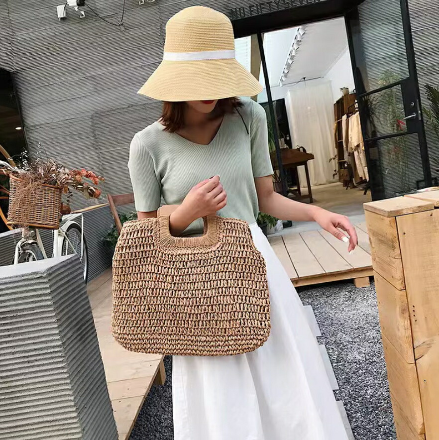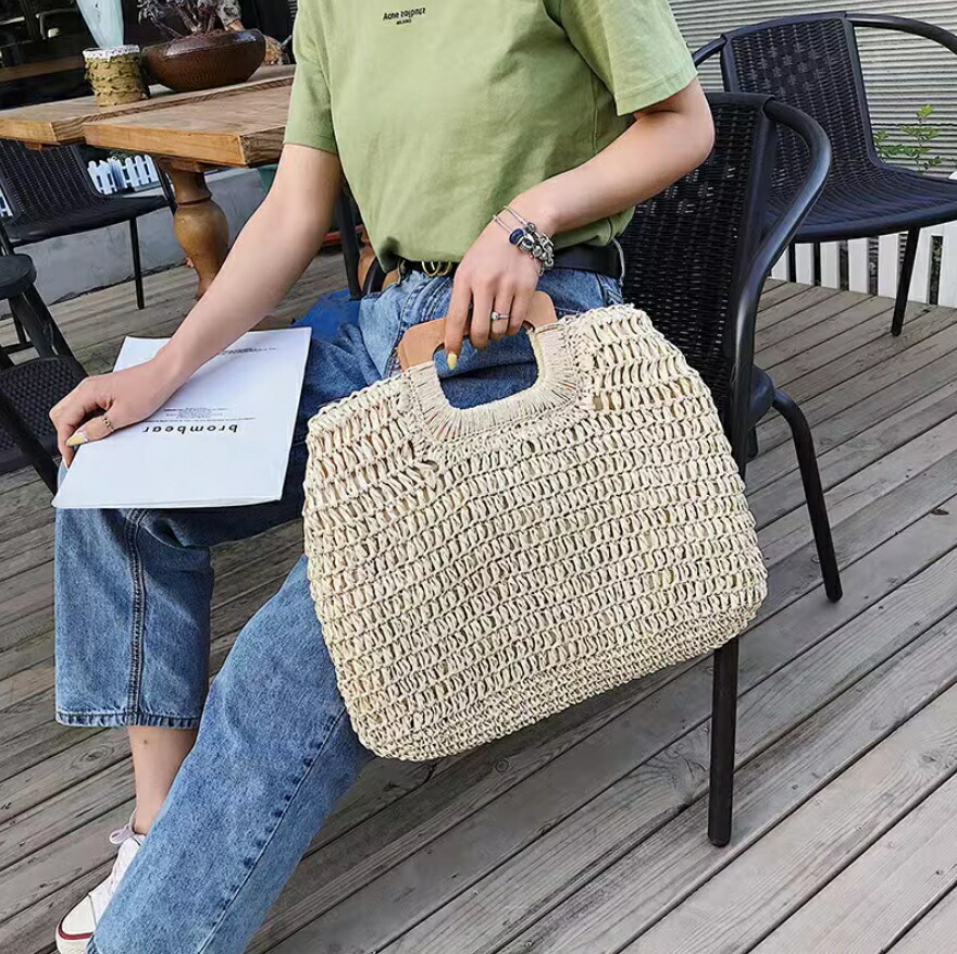 ペーパースクエアカゴバッグ ウッドハンドルビッグトートバッグ かごバッグ おしゃれ レディースバッグ 春夏