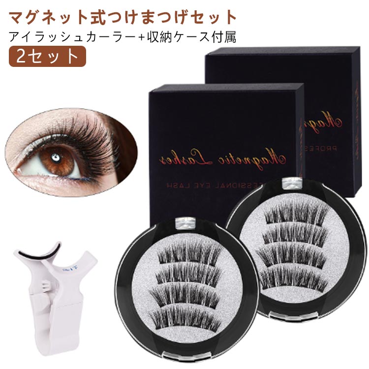 2セット内容:マグネット式付け睫毛*2ペア(合計8枚) + 透明収納ケース*2 + 専用アイラッシュカーラー*1 + 説明書タイプ:ナチュラルタイプ(磁石4枚付きタイプ)、目尻ボリュームタイプ(磁石4枚付きタイプ)収納ケース:7.3*7.3*2.2cm※商品のサイズは手作業で測定させて頂いておりますので、若干の誤差があります。【使い方】1.まつげをラッシャーのマグネット部分に置きます。 磁気ストリップが向かい合っていることを確認してください。(磁石が上を向いているほうが下まつげ、磁石が下を向いているほうが上まつげです。)2.ラッシャーを目の方に動かし、腕を本物のまつげの上下に保ちます。3.上まぶたをまぶたにそっと触れ、下腕を閉じてラッシャーを放します。4.まつ毛を抜いたいときは、マグネットの位置を見つけて目元からやさしくひねるだけで出来上がり!5.使用後は、ボックス内の磁気ストライプにまつげを置いてください。