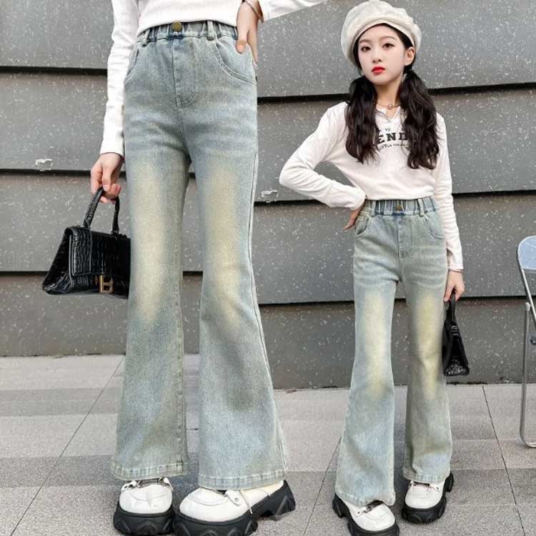 女の子 デニムパンツ 子供服 キッズ ジーンズ ボトムス 長ズボン おしゃれ パンタロン フレアパンツ 学生 デニム ロングパンツ 可愛い 演出 散歩 発表会 入学式 普段着 ブルー 110cm 旅行