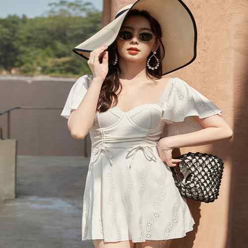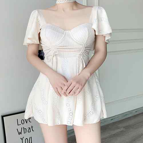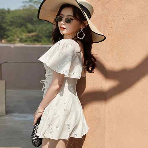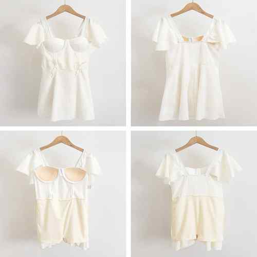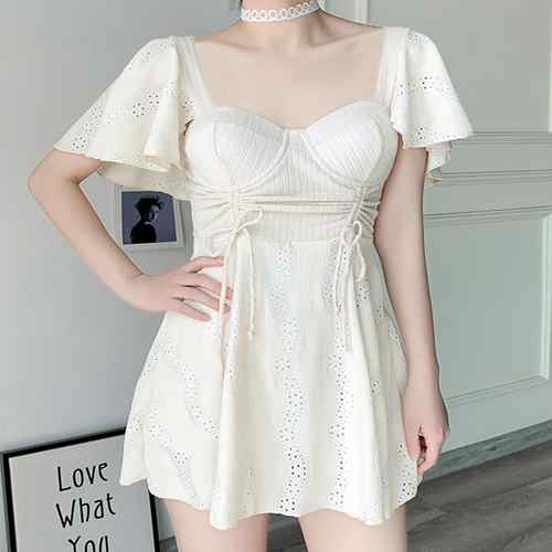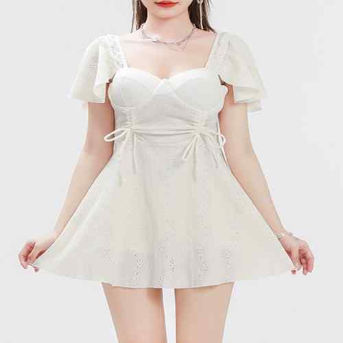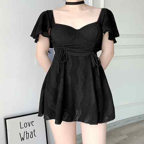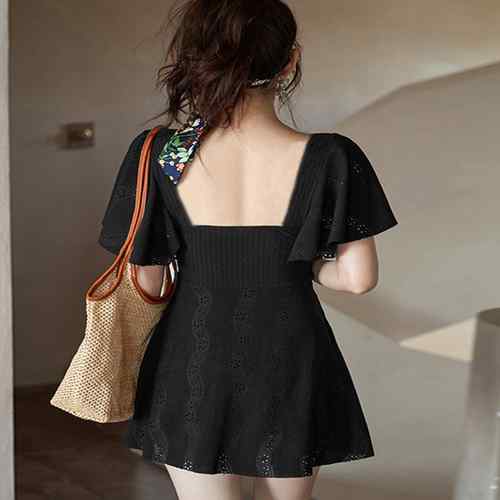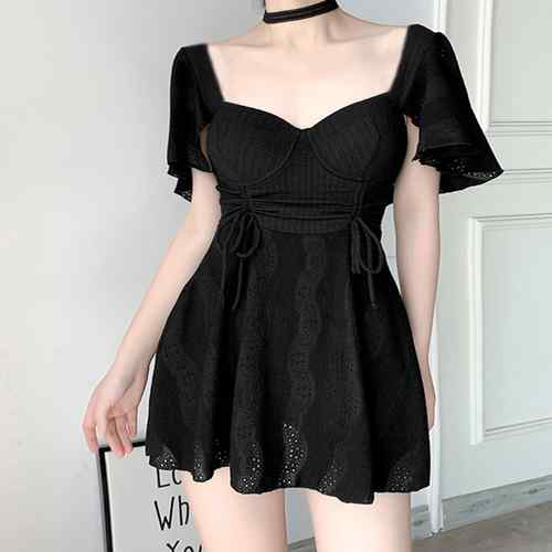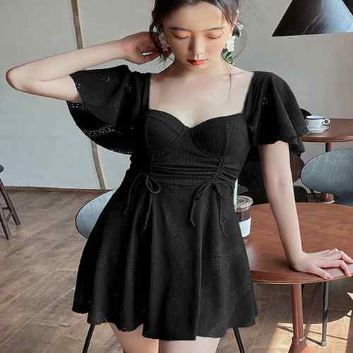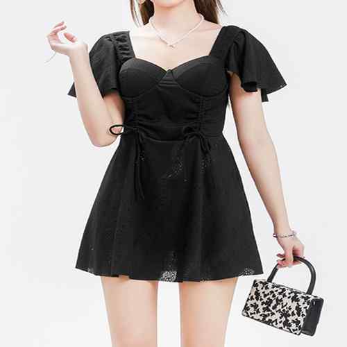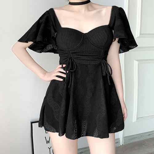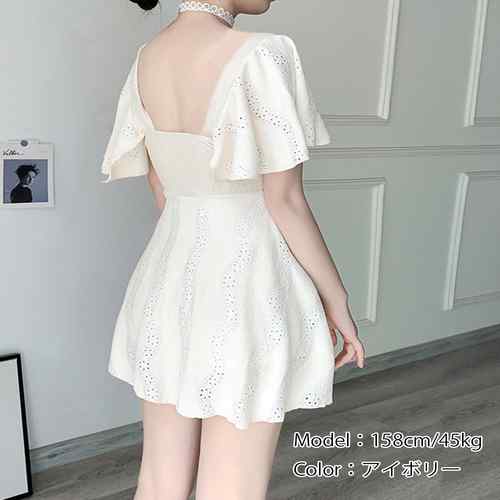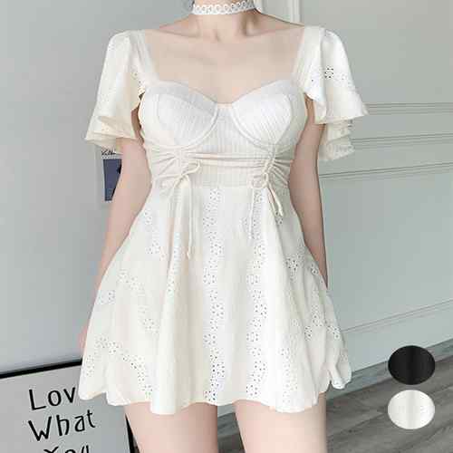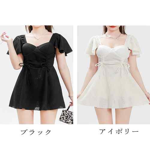 フリル袖フレアワンピース水着 着やせ 水着 新作 ブラック アイボリー