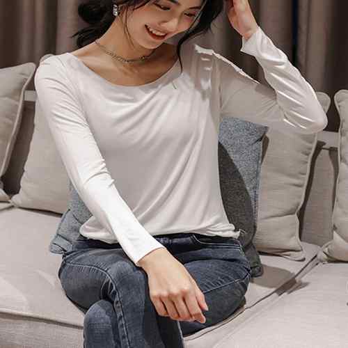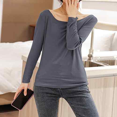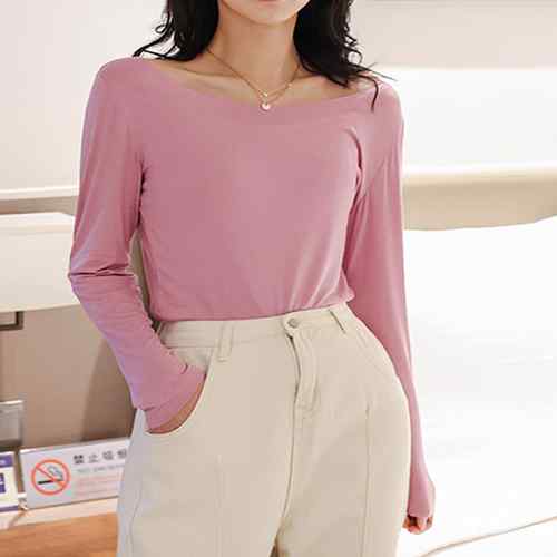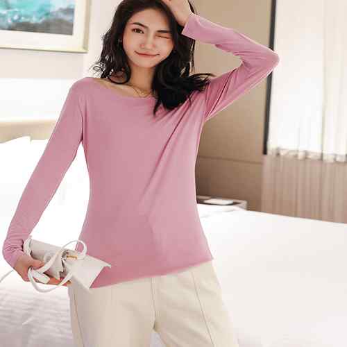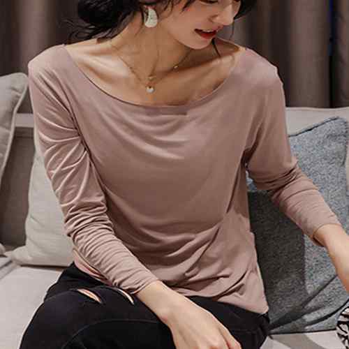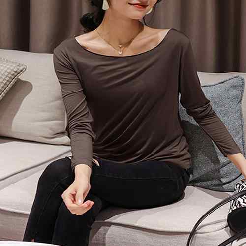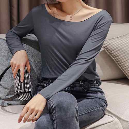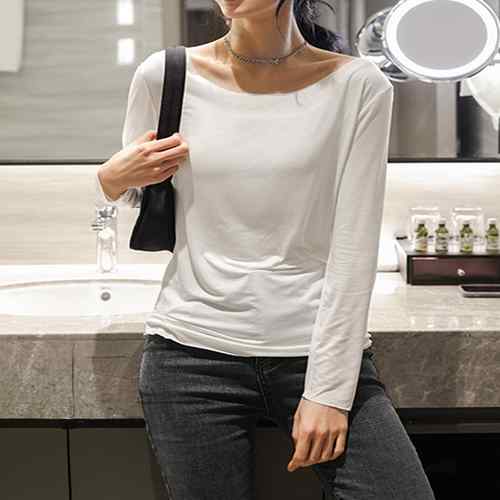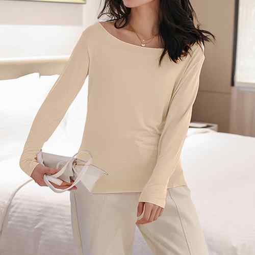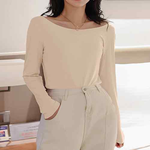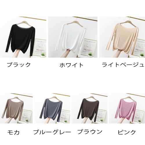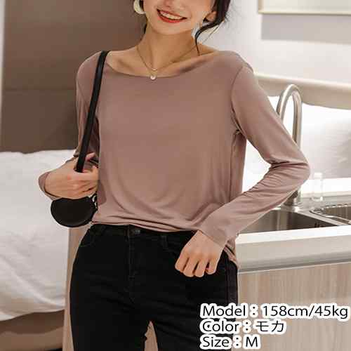 ベーシックトップス 丸首 細身 着やせ レディースファッション 通販 モカ ライトベージュ ブルーグレー ブラウン L M
