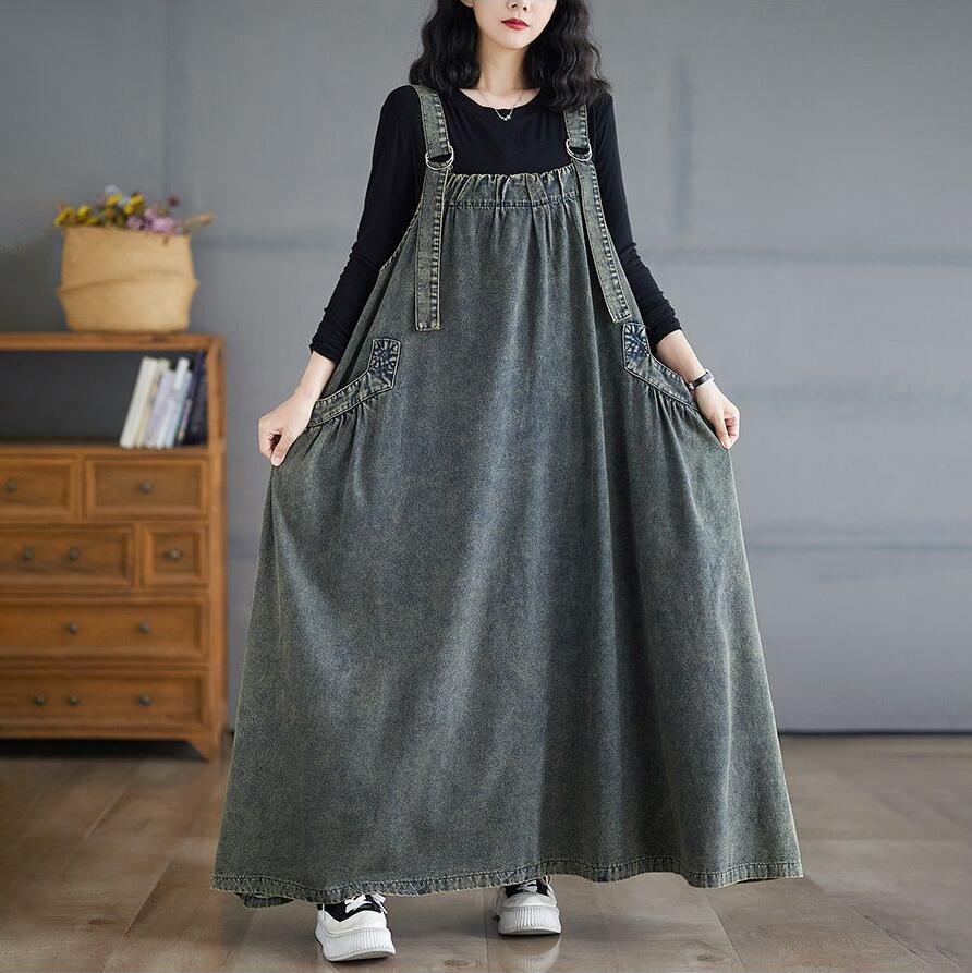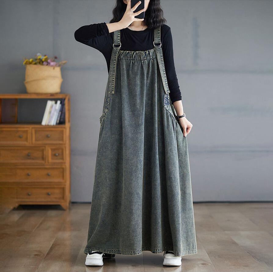 ワンピース デニム ジャンパースカート Aライン ジャンスカ カジュアル キャミワンピ 体型カバー ポケット スリット ロングスカート マタニティ 細見 フロントジップ