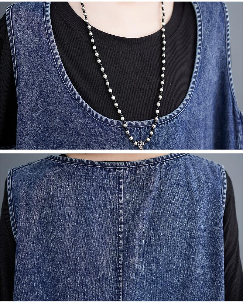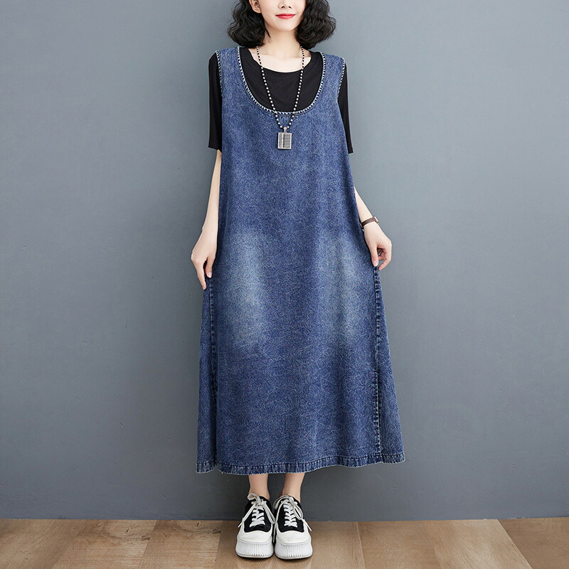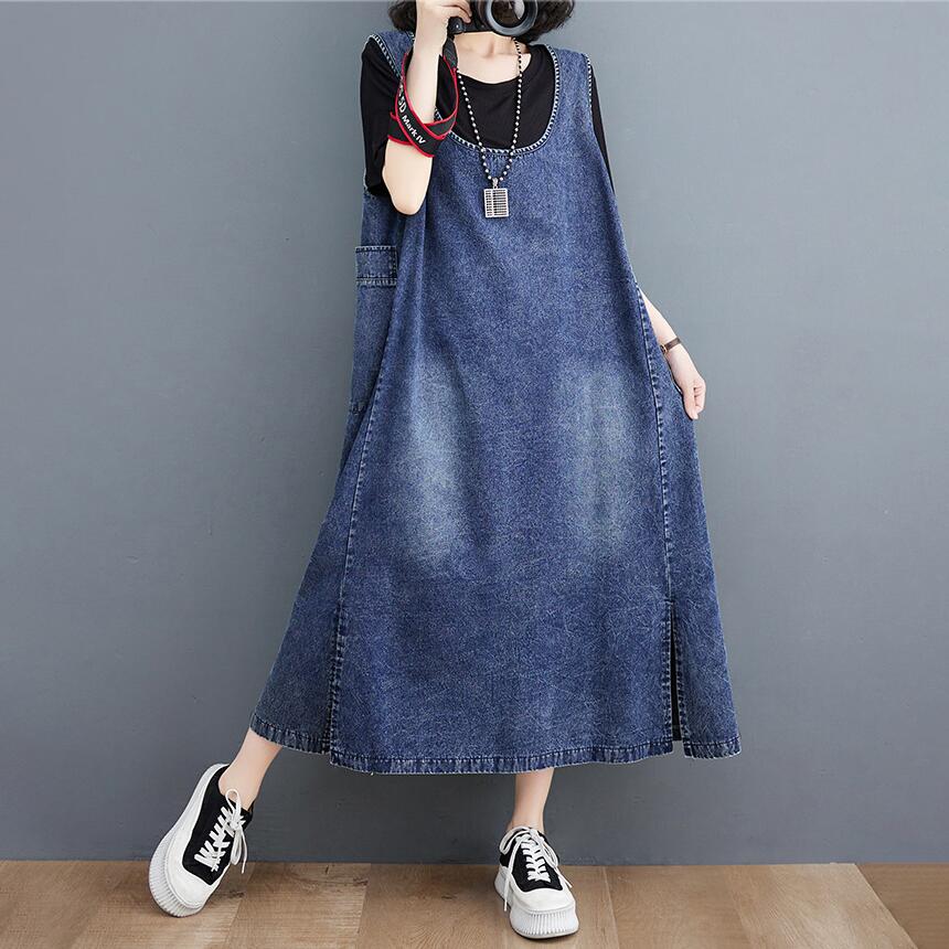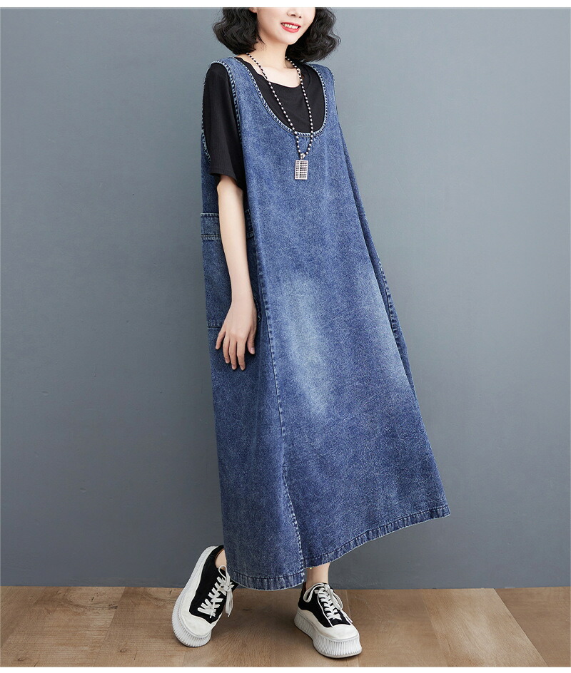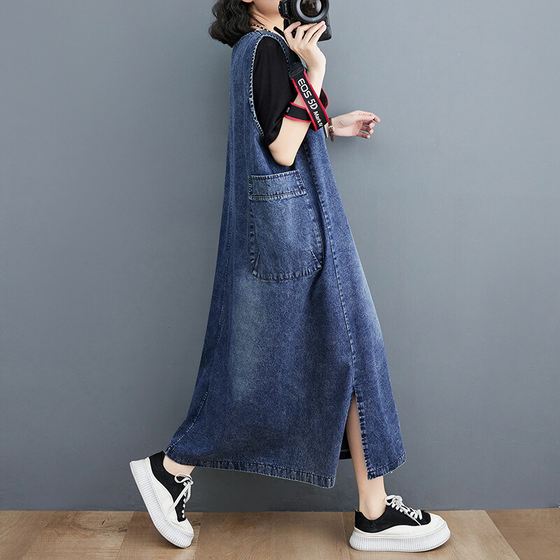 デニムワンピース ガウンワンピース シャツワンピース 大きいサイズ ポケット付き ロングワンピース 袖なし ロング丈 ゆったり 体型カバー カジュアル