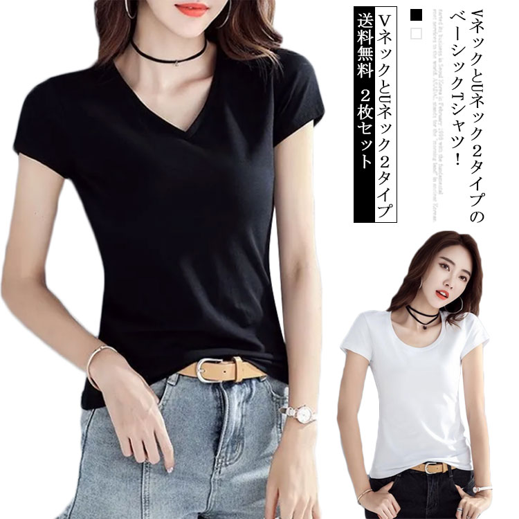 Tシャツ Vネック レディース 半袖 トップス Tシャツ カットソー 人気 Vネックブラック2枚 Vネックホワイト2枚 Uネッククブラック2枚 Uネックホワイト2枚 S M L XL 2XL 3XL 4XL
