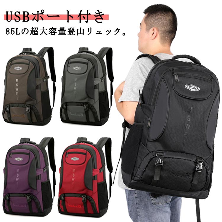 登山リュック 85L 大容量 ファスナ バッグ 男女兼用バッグ バックパック リュック 豊富な品揃え ブラック(USBポート付き) グレー(USBポート付き) パープル(USBポート付き) レッド(USBポート付き) ブラウン(USBポート付き)
