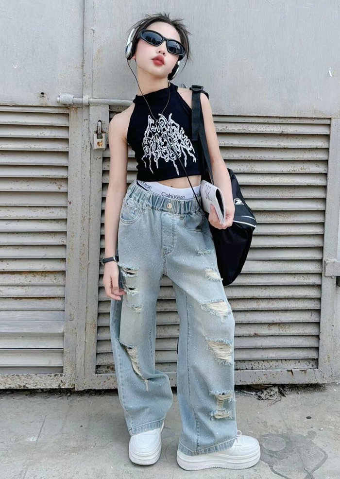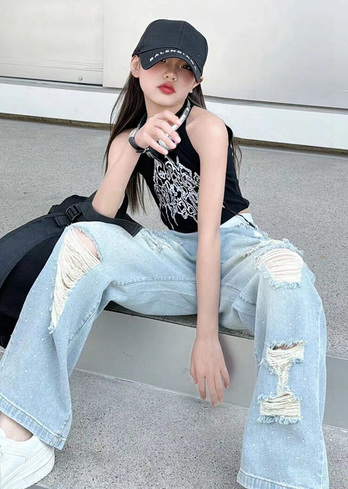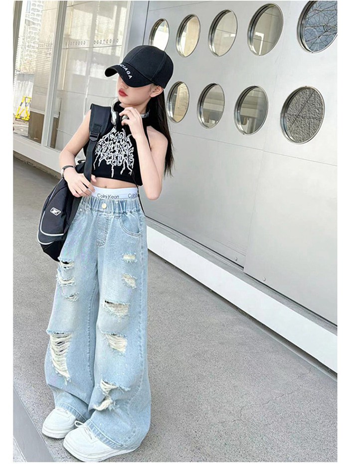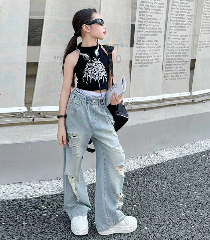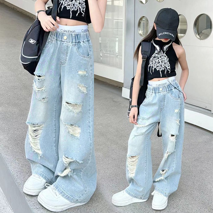 子供服 デニムパンツ ダメージ加工 ロングパンツ キッズ服 子供服女の子 キッズ 子供 こども ズボン パンツヒップホップジュニアダメージデニムパンツ ワイドパンツ ダンス ジーンズ 幼稚園 お 衣装