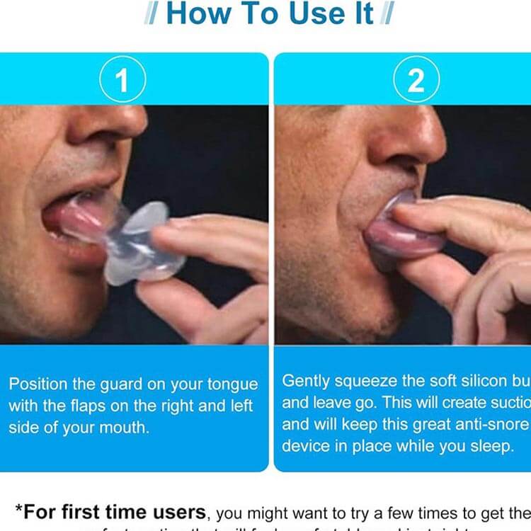 ※慣れるまでは短時間からの使用で慣らしてください。 舌の固定する位置やバルブと密着具合によっては 苦しくなることがあります。 最初は舌を前方に出しすぎずに、徐々に舌を出して 気道を開くようにしてください。