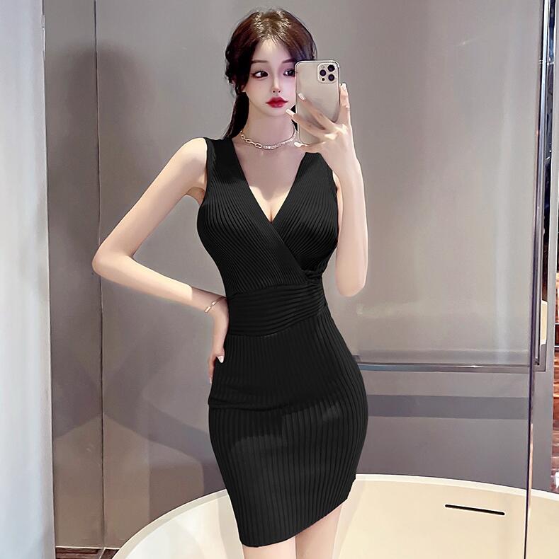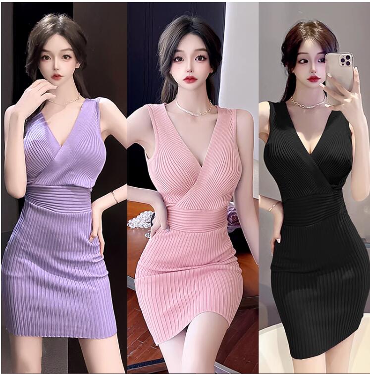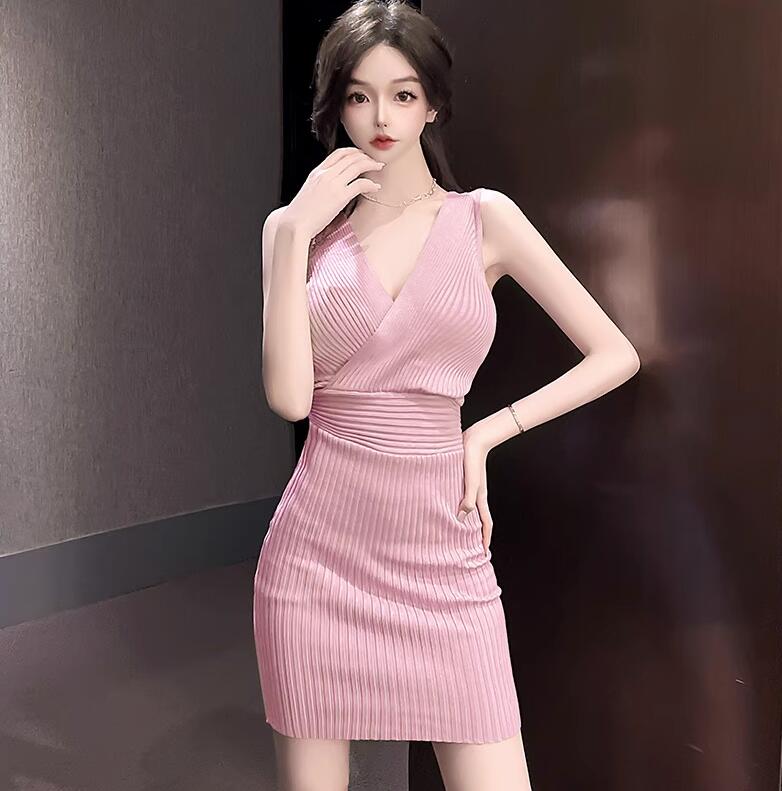 リブニット ワンピース ノースリーブ ワンピース 続々登場 黒色 ピンク 紫色