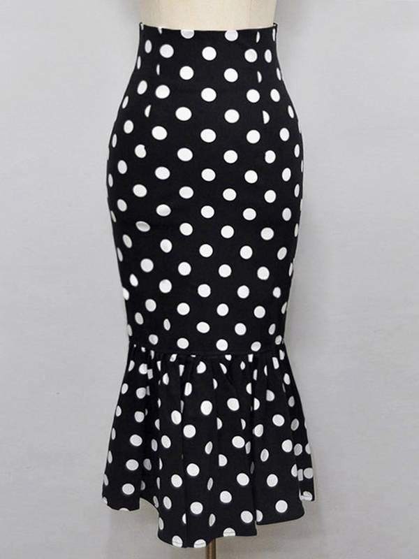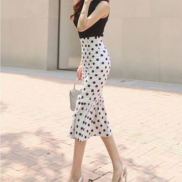 スカート レディース マーメイド ミモレ丈 春 夏 ドット柄 水玉 ブラック ホワイト 2色展開 フレア タイト ハイウエスト 休日 お出かけ デート コーデ 女子会 通勤 エレガント おし 普段使い