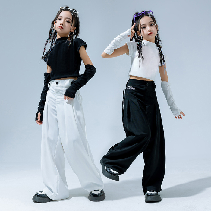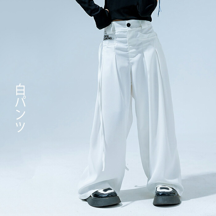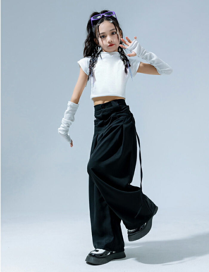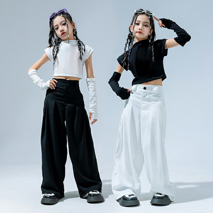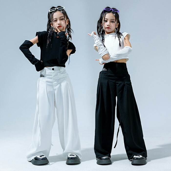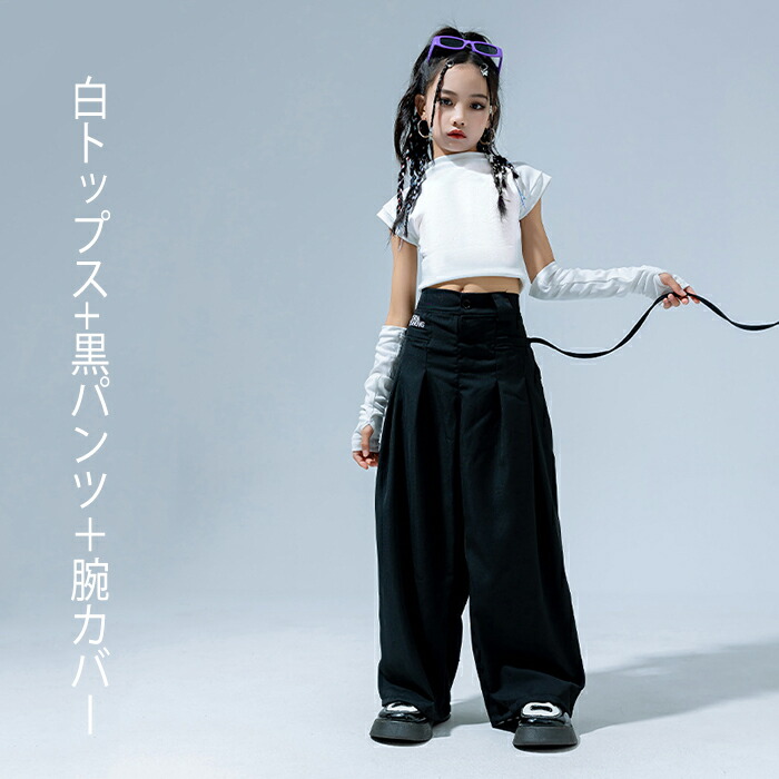 ダンス衣装 キッズ パンツ 女の子 セットアップ 上下セット ゆったり ホワイト 白 黒 トップス 腕カバー ジャズダンス ヒップホップ 派手 韓国 kpop 応援団 演出服 団体 かっこいい