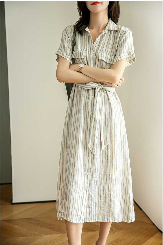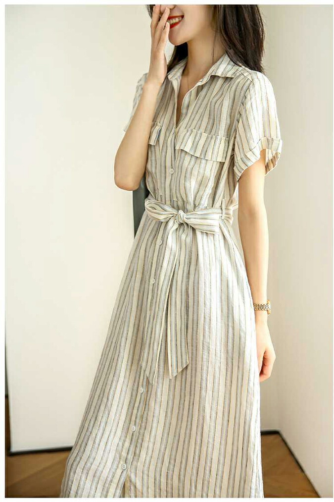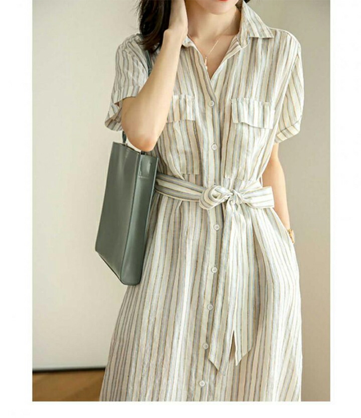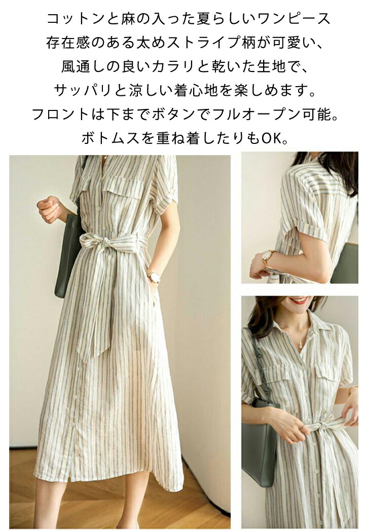 綿麻 半袖 ストライプ柄ワンピース 綿 ワンピース 続々登場 M L XL