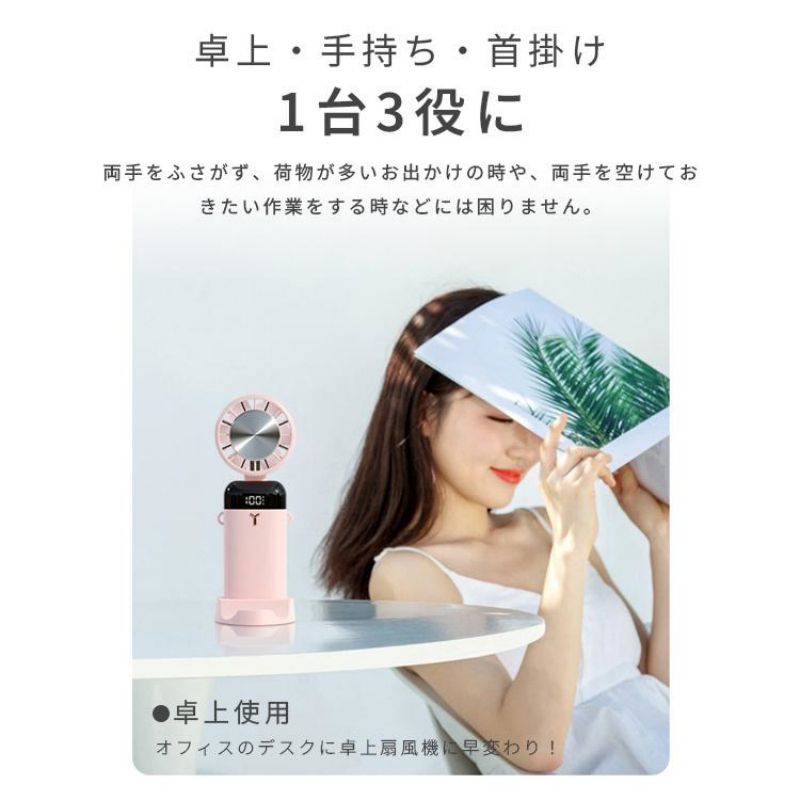 首掛け扇風機・手持ち扇風機・卓上扇風機・首掛けクーラー・スマホスタンドなどのひとりひとりの良いとこ取りをした手持ちクーラー扇風機。 付属品にストラップも付き、瞬間首掛け扇風機になれますので、優れる多様性です。