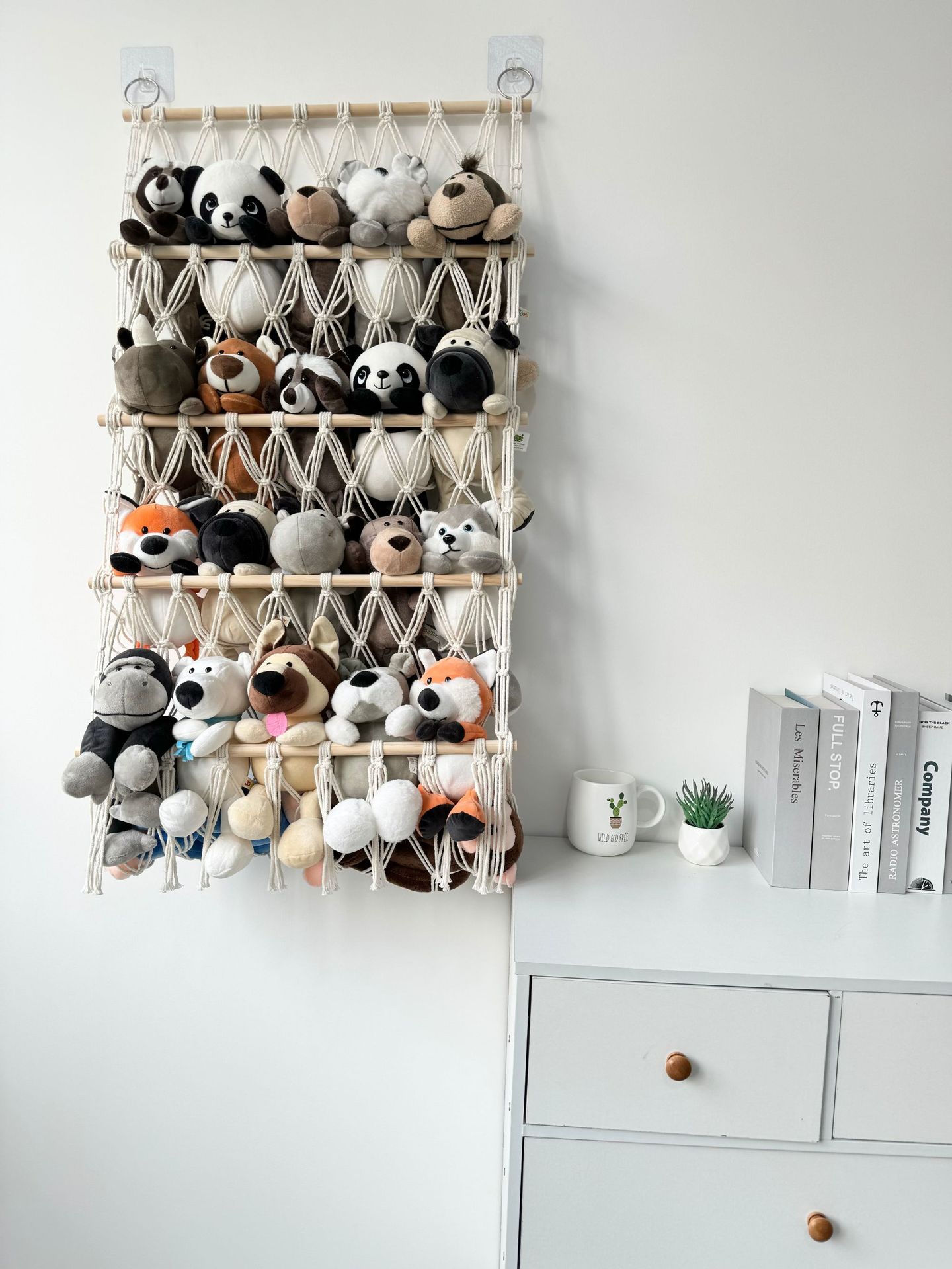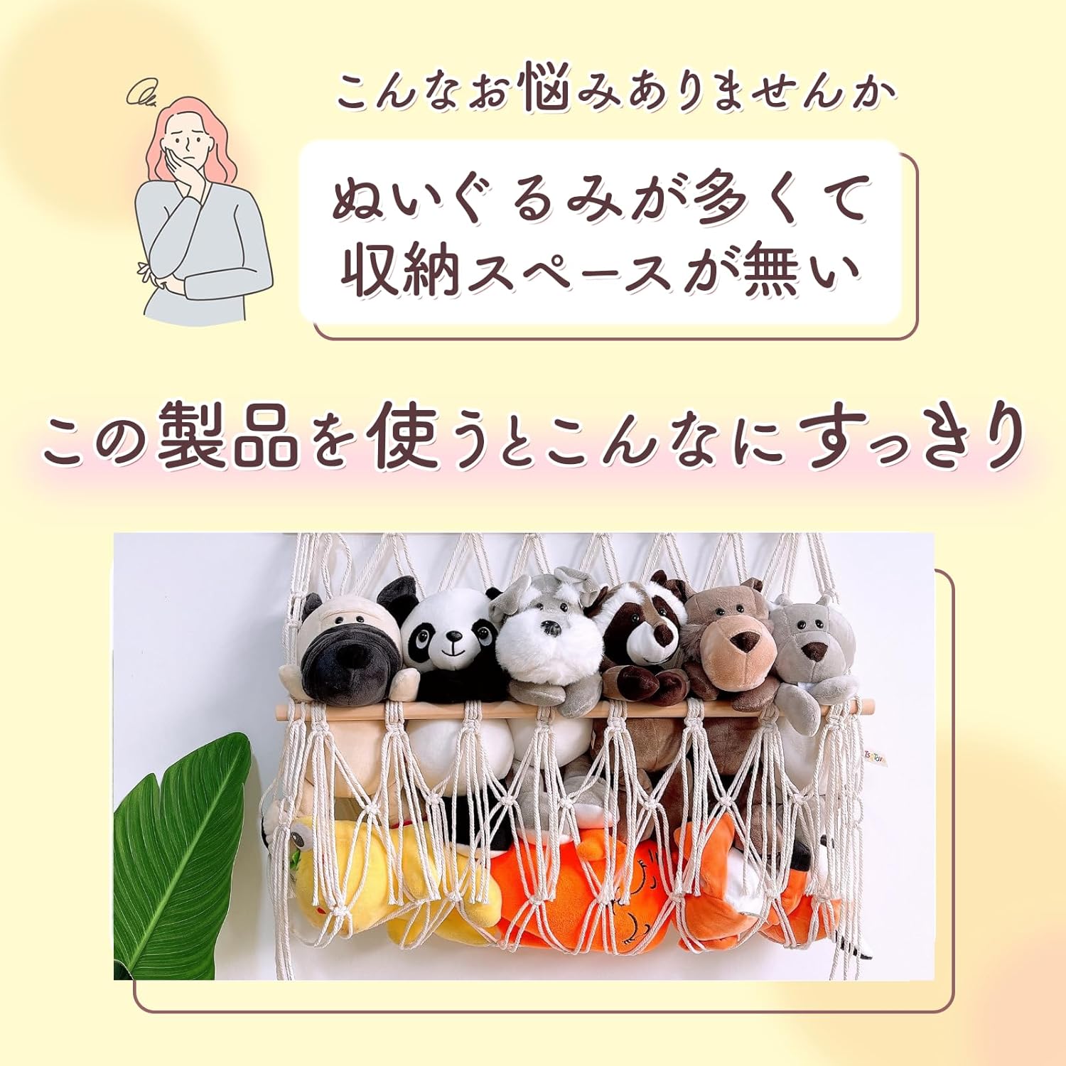 【スペース活用】空間を有効に使って、お部屋を広々と!床に散らばるぬいぐるみを壁面に収納することで、お部屋のスペースを有効活用。遊びスペースが広がり、お部屋がもっと快適な空間に変わります。