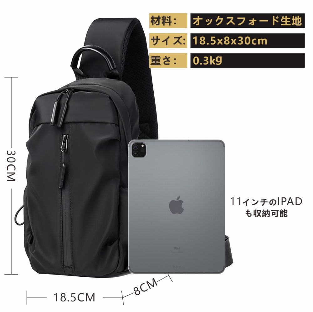 サイズは30x18.5x8cm、重さは0.3KGで、11インチのiPad、本、傘、その他のサイズのアイテムを収納するのに十分な大容量です。