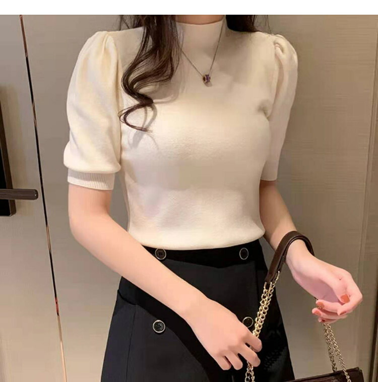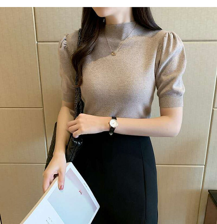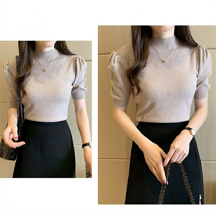 リブニット パワーショルダー5分袖 秋 さらっとした肌ざわり サマーニット ハーフタートルネック 半袖リブニット トップス オフィスカジュアル スタンドネック ニット カットソー 無地 大人 Tシャツ