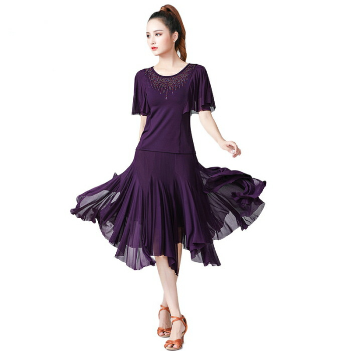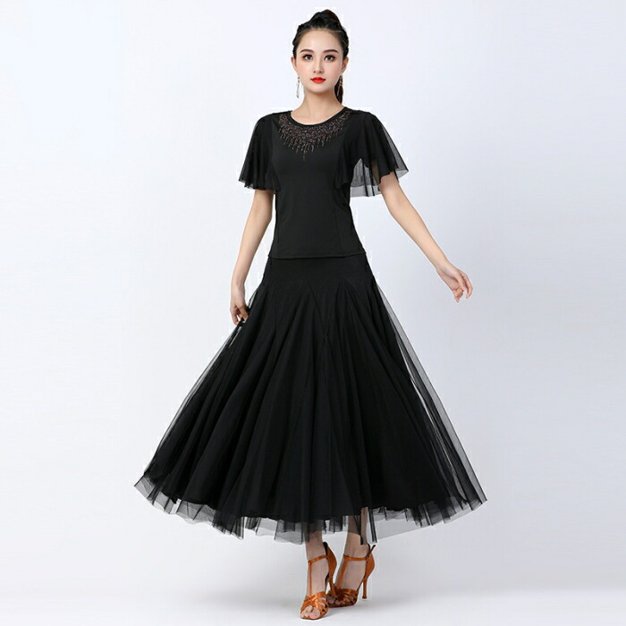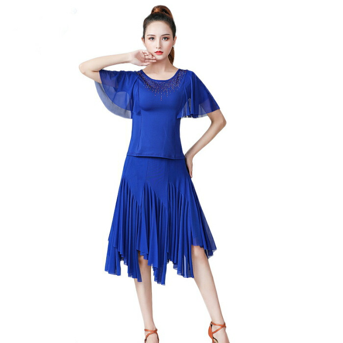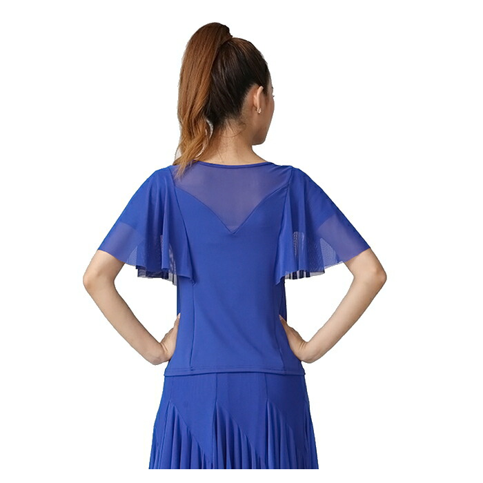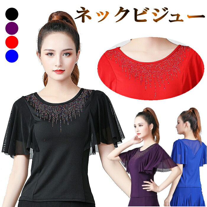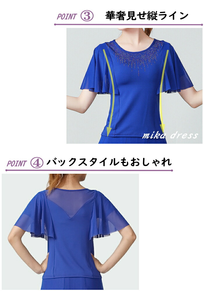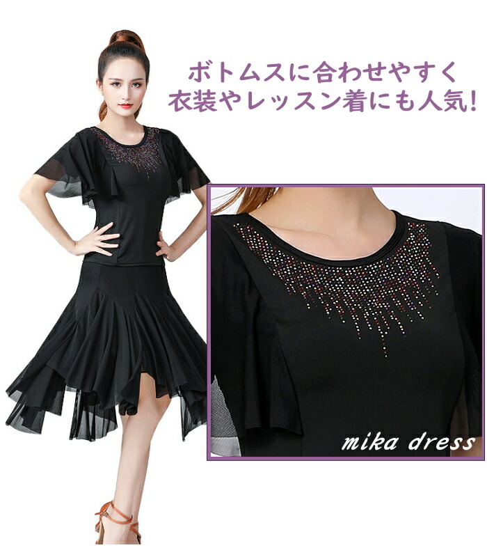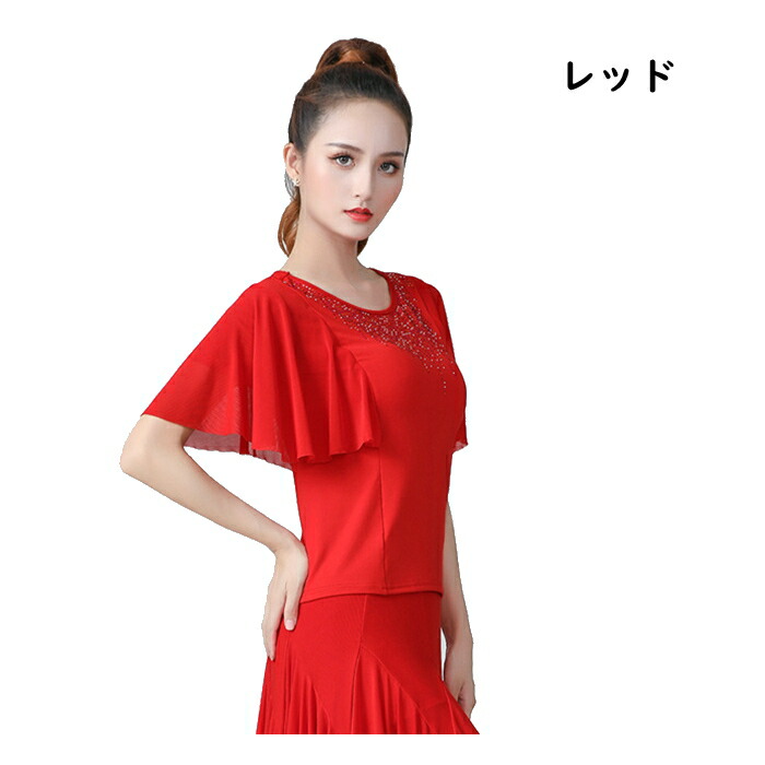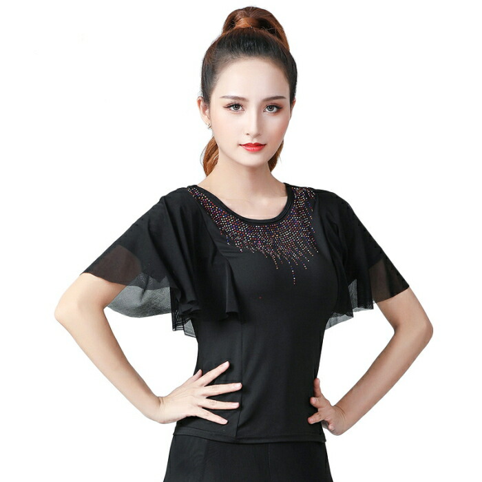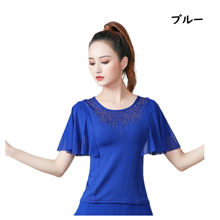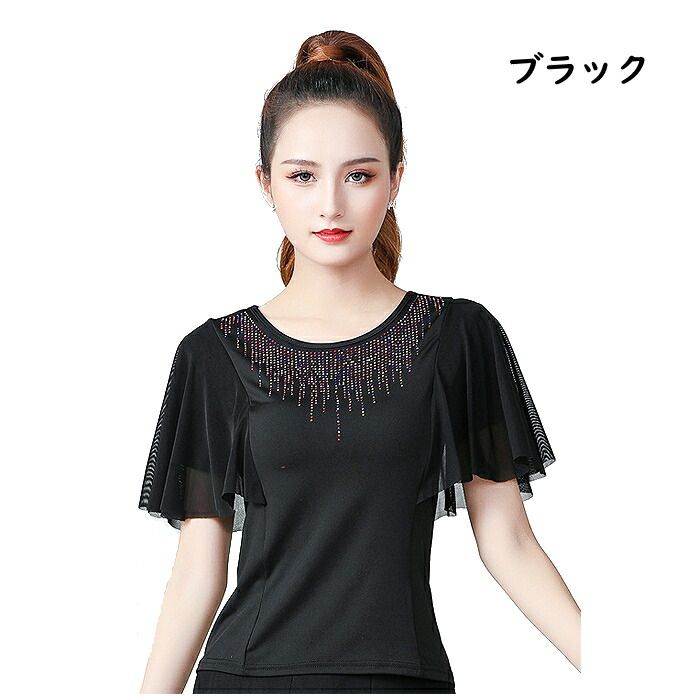着痩せ効果絶大 フリル袖 トップス 社交ダンス コーラス 半袖 フレア スリーブ ストーン きらきら 練習着 レッスン着 カラオケ衣装 衣装 ダンス ジャズダンス タップダンス フォーマル ラテン