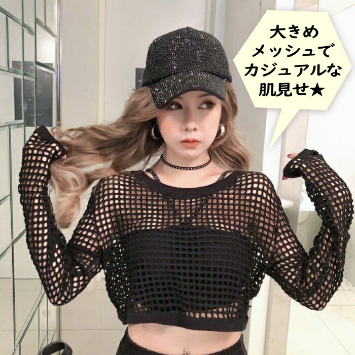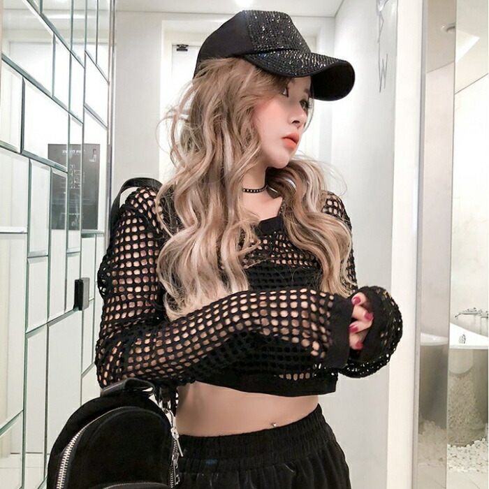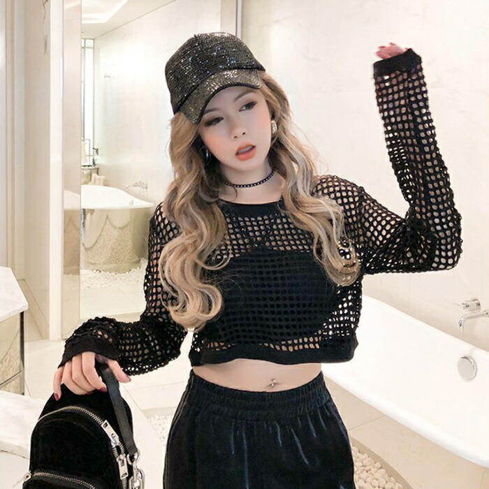 ダンス 衣装 ヒップホップ 大人 韓国 ショート丈 Tシャツ トップス メッシュ へそ出し チビT ミニT おしゃれ 編み ステージ衣装 派手 セクシー カット ストリート