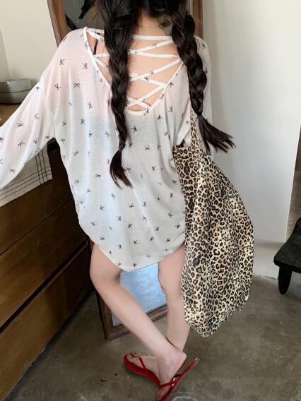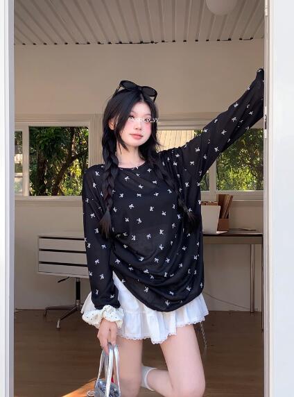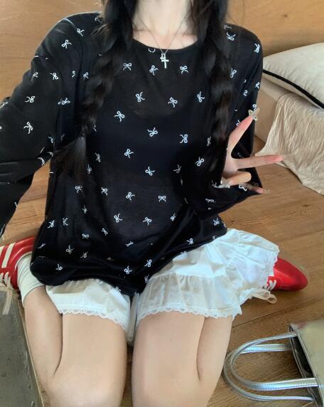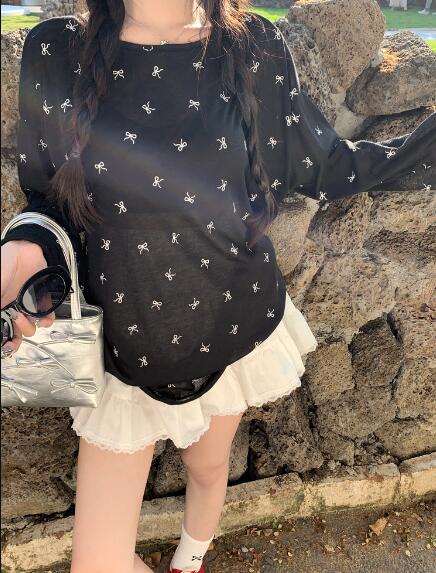 リボン透け感Tシャツ長袖トップスカット トップス Tシャツ カットソー 特集 ブラック ホワイト