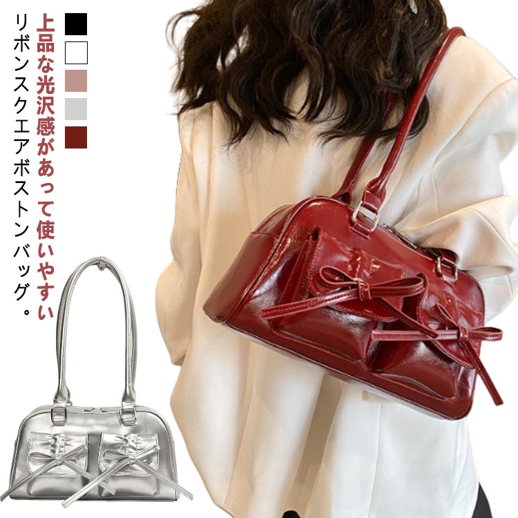 ミニバッグ ショルダーバッグ PUレザー 小さめ スクエアミニボストンバッグ バッグ 撥水 軽量 筒形 ハンドバッグ 横長 リボン 大人 自立 ロングハンドル 肩掛け ホワイト ピンク シル ブラック