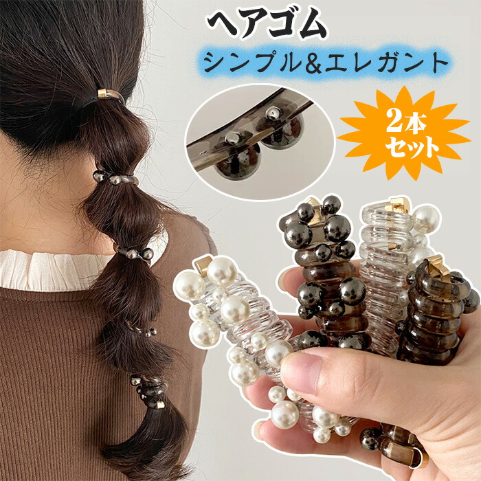 コイルポニー 2本セット パール ヘアゴム ヘアアクセサリー コイルアップ 髪留め 髪飾りワイヤーポニー 髪ゴム軽量 髪飾りシンプルブラック