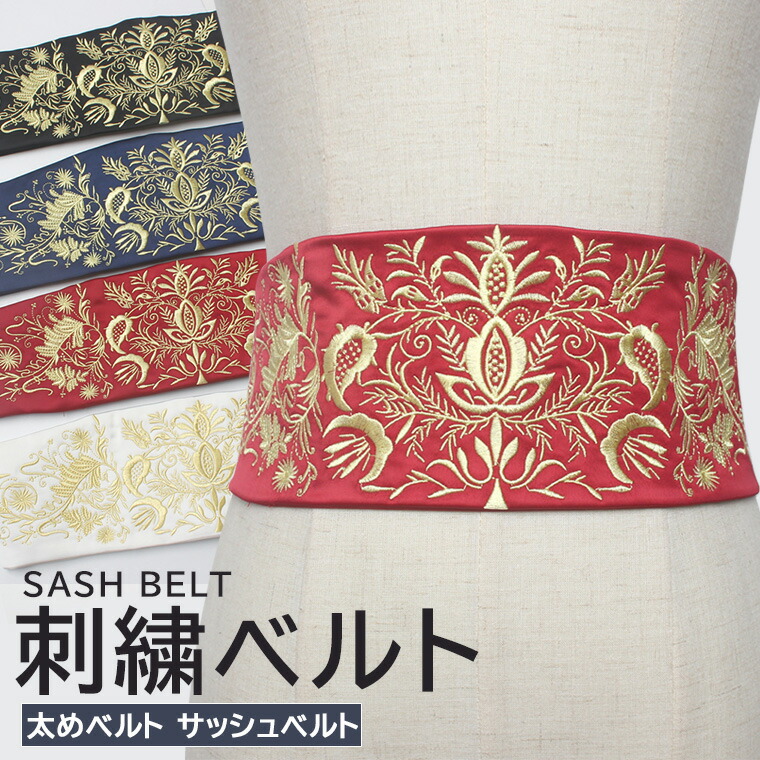 刺繍ベルト サッシュベルト コルセット ハイウエスト ベルト ファッション ウエストベルト ウエストマーク 太ベルト 布ベルト 刺繍 着物 帯 4色 ブラック レッド ホワイト コスプレ ネイビー