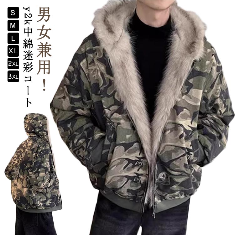 迷彩コート メンズ 中綿コート ファージャケット 秋冬 レデイース 裏ファー アウター フェイクファー 裏起毛 大きいサイズ 厚手 暖かい 防寒 中綿ジャケット モコモコ ふわふわ ファー フード付き